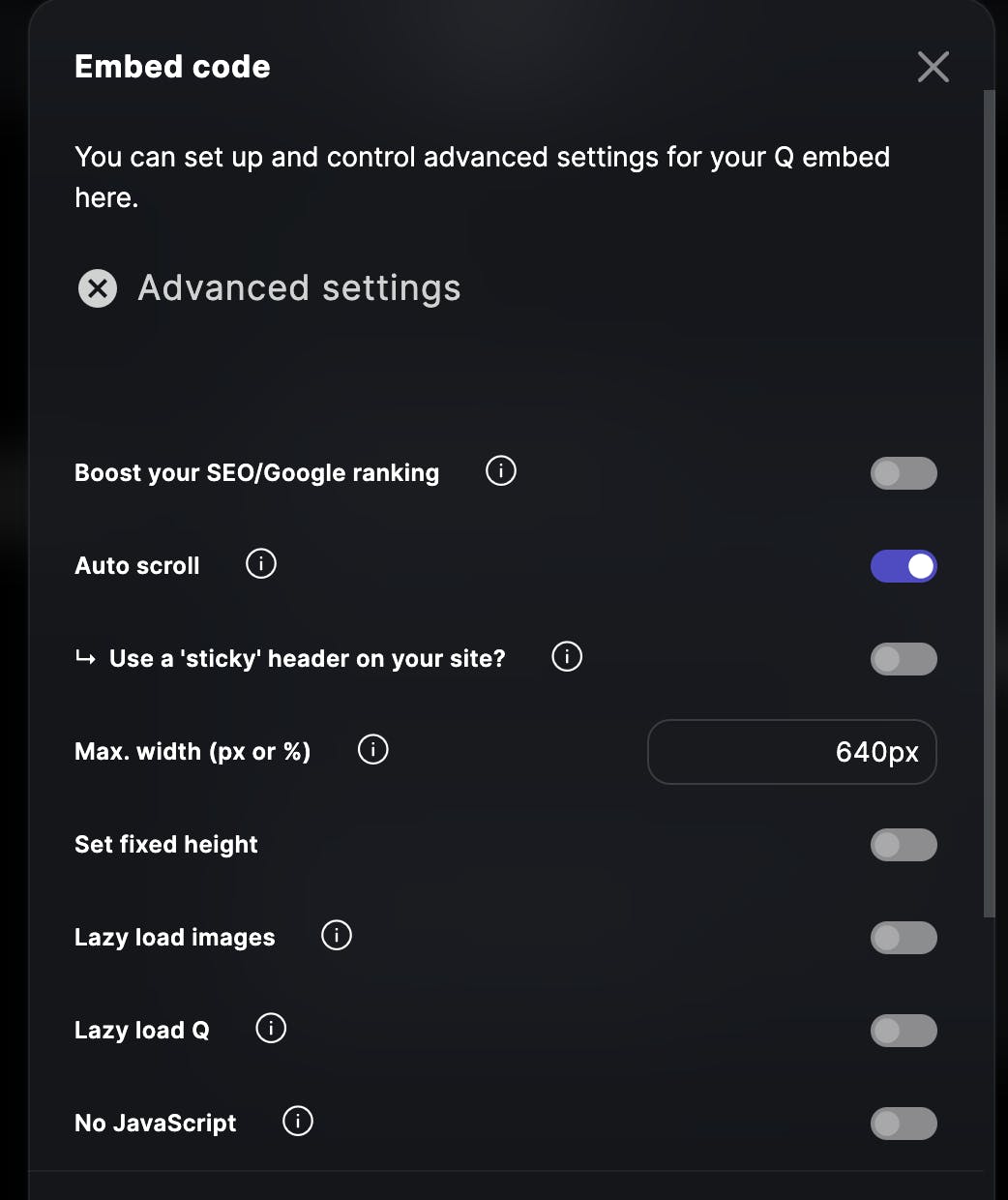 We also provide you with an embed code to use our your website or app. The embed code also comes with lots of options to fit every websites needs (see screenshot)