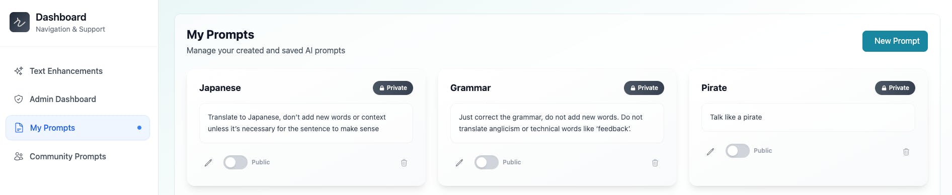 Edit, add, or delete custom prompts right from your browser in our web dashboard.