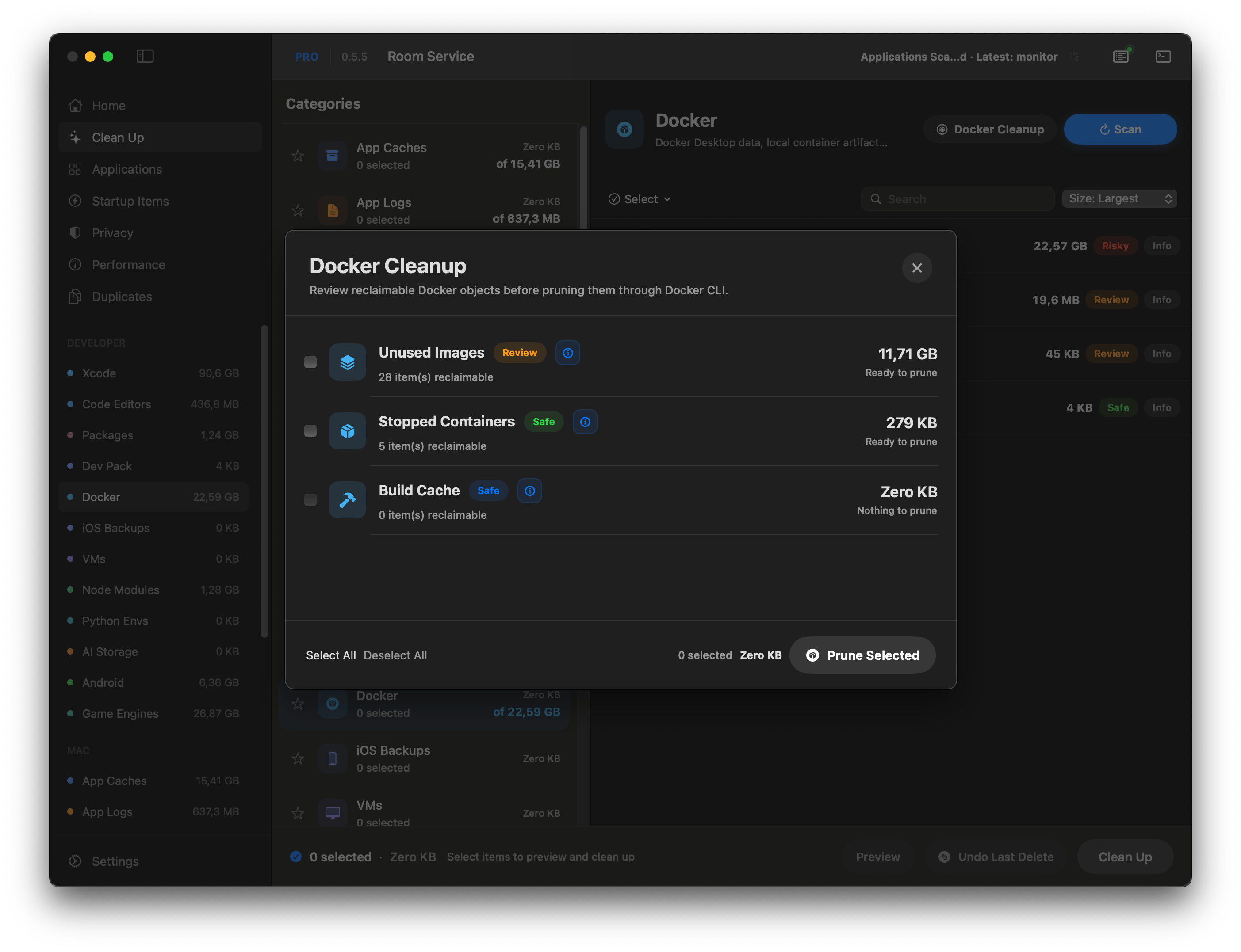 Room Service update: better Docker cleanup, browser caches, and dev-focused improvements