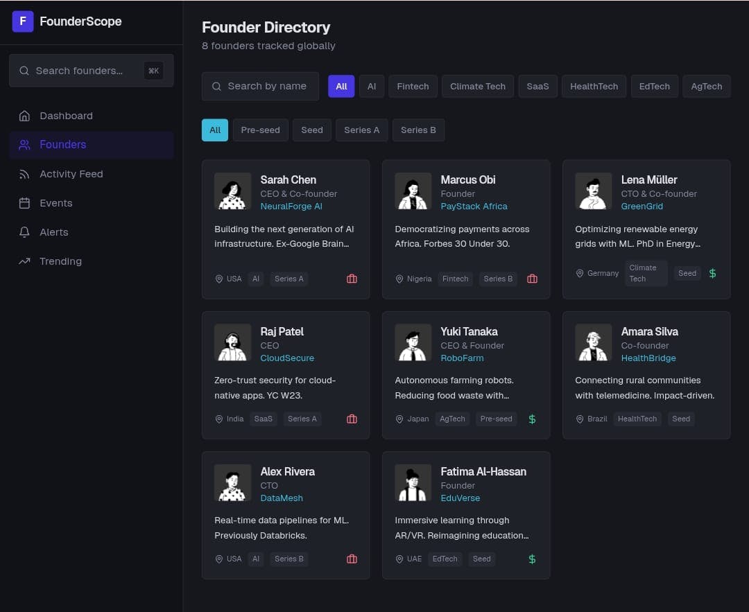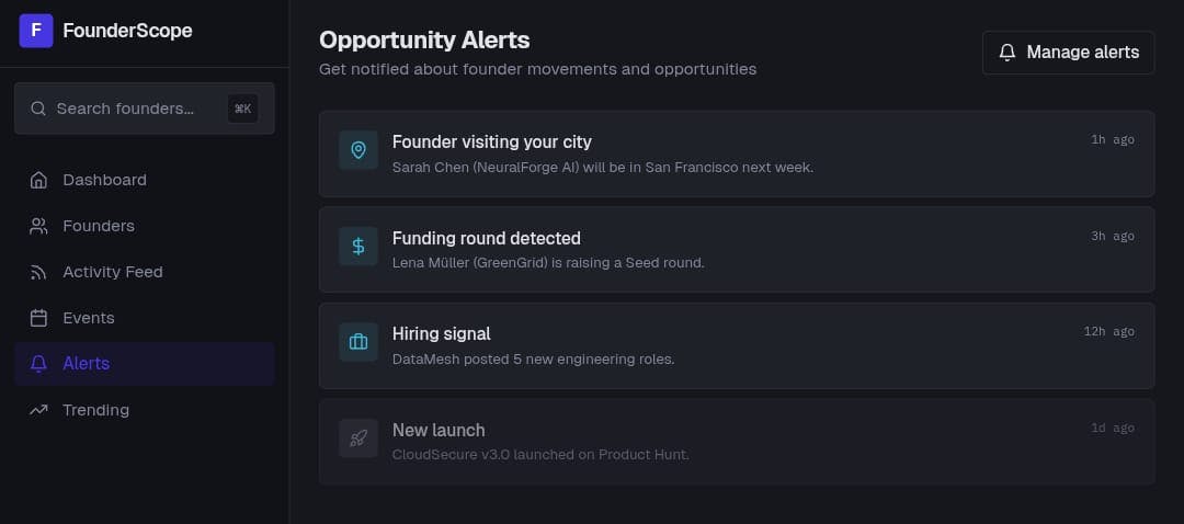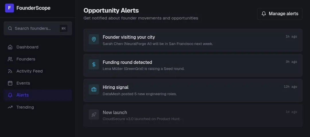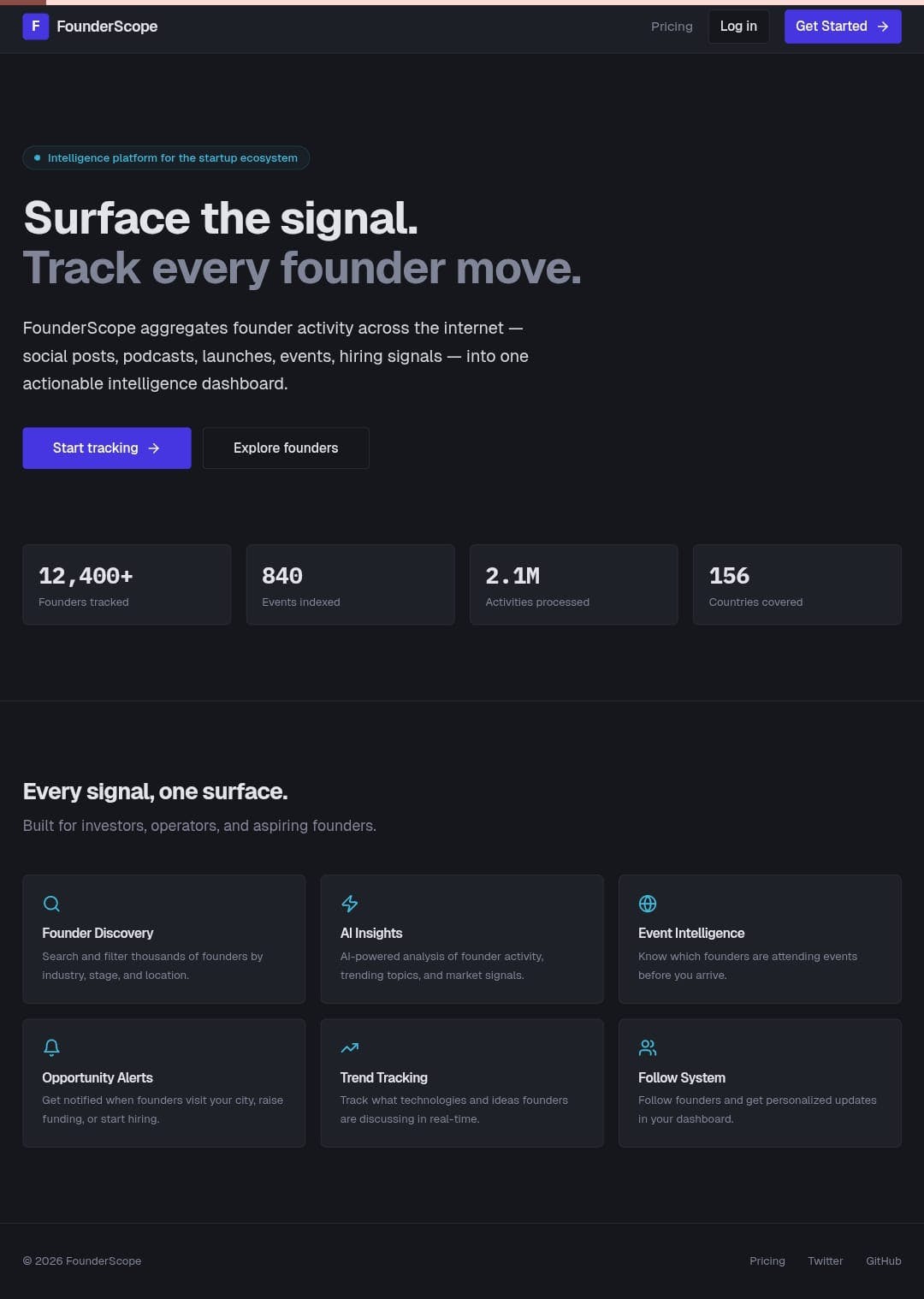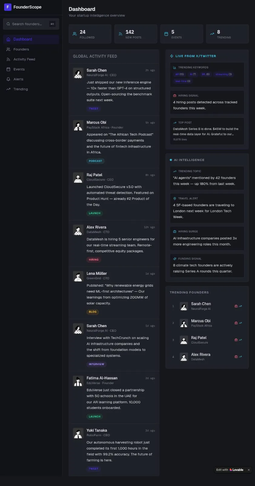 It aggregates founder activity across the internet β€” social posts, podcasts, launches, events, hiring signals, and even city-visit alerts β€” into one clean, actionable dashboard.