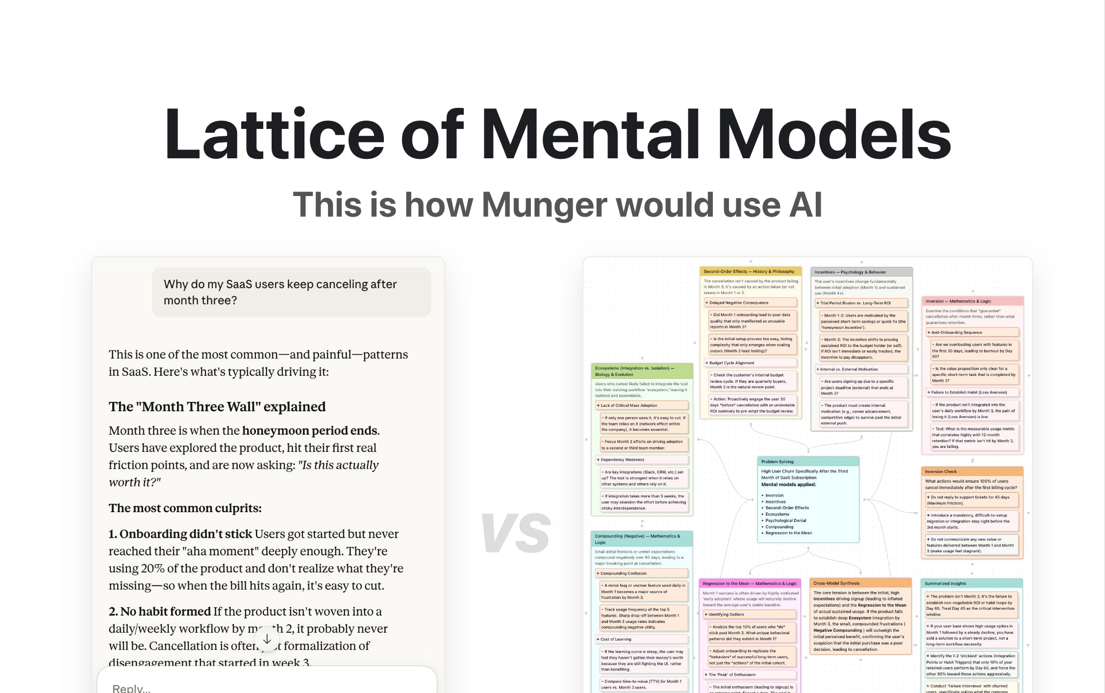 Take the problem "Why does my SaaS product keep losing customers after month 3?" AIFlow might simultaneously apply:
