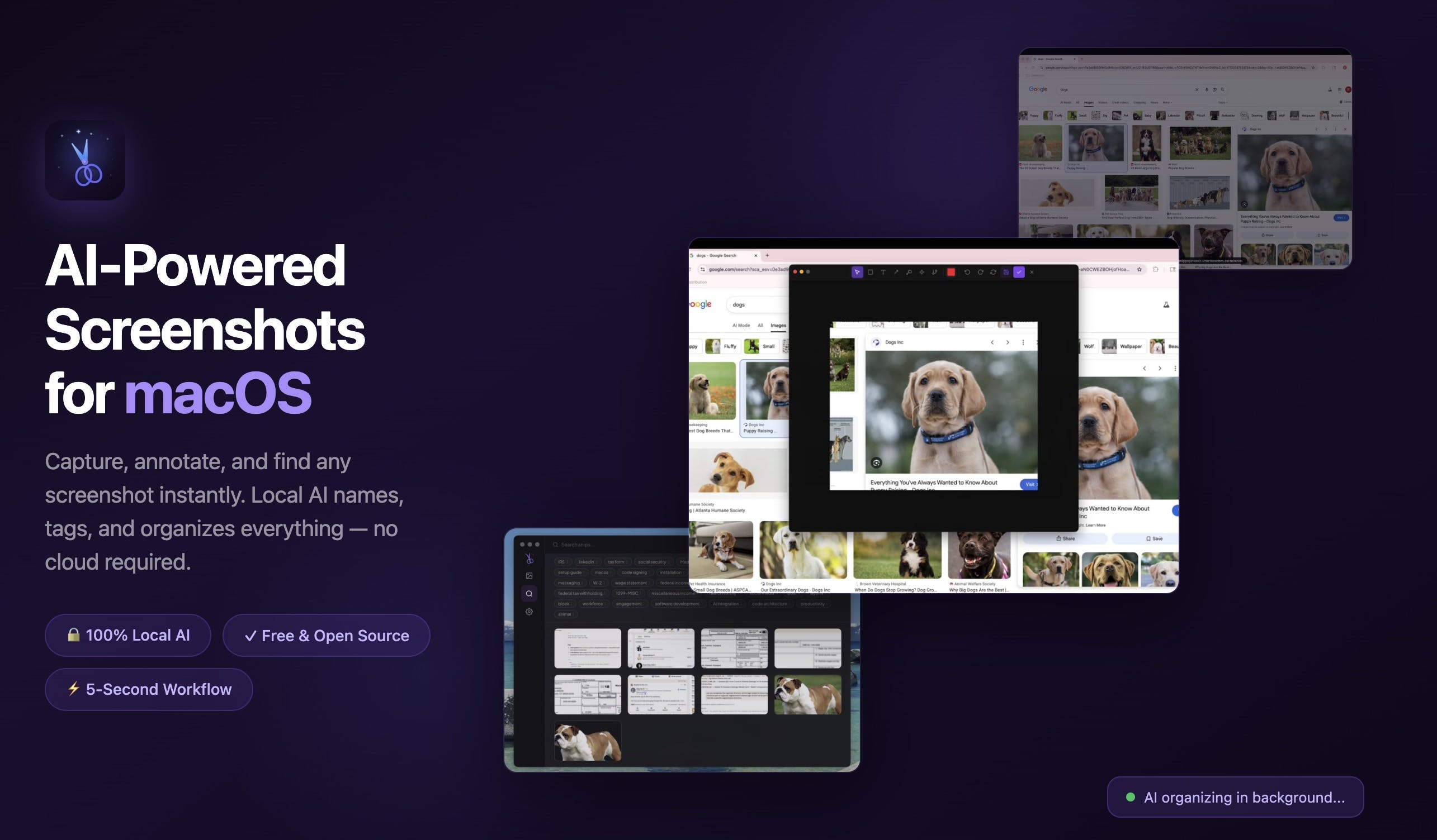 Snip is a free, open-source macOS screenshot tool with on-device AI. Capture any region with Cmd+Shift+2, annotate with arrows, text, blur, and AI object segmentation, then press Esc — your annotated screenshot is on your clipboard in under 5 seconds. Save it and a local vision model automatically names, tags, and categorizes it in the background. Need to find it later? Just describe what you remember — semantic search powered by local embeddings finds the right screenshot instantly. No cloud, no API keys, no accounts. 100% private, runs entirely on your Mac.