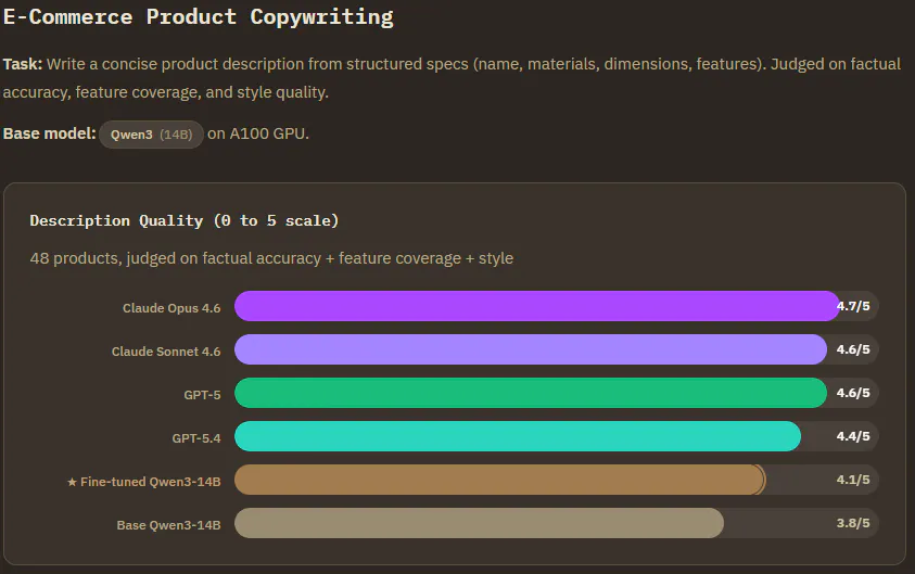 E-Commerce Copywriting (Qwen3-14B) : Frontier wins on stylistic polish. But here's the thing. The finetuned model had the lowest hallucination rate of every model tested. It never invented features like "military grade protection" that weren't in the product spec. It preserved every dimension, capacity, and warranty detail without embellishment. Feature coverage went from 75-80% to 85-90% after fine-tuning, and the repetition problem the base model had (product names appearing multiple times in a single description) was completely eliminated.