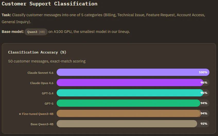 Customer Support Classification (Qwen3-4B) : The improvement compared to base model was small, but definite. Edge cases where the base model confused "Account Access" with "Technical Issue", and feature requests it kept mislabelling. Finetuning fixed those.