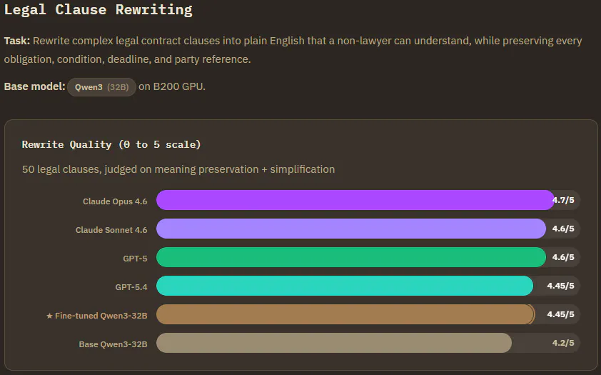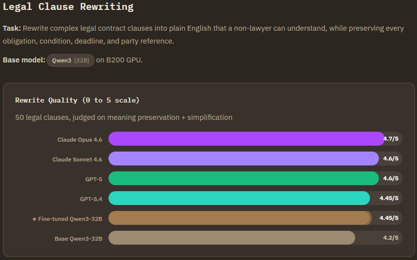 Legal Clause Rewriting (Qwen3-32B) : Tied with one of the top frontier models, within 0.25 of the best. The finetuned model learned to explicitly restate each legal qualifier in simple terms rather than glossing over them. It preserved temporal details like "2 year post employment period" that the base model sometimes dropped. Frontier models added useful extras like mini glossaries, but that goes beyond the rewrite brief. The finetuned model stuck to the task.