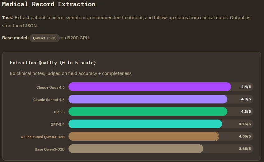 Medical Record Extraction (Qwen3-32B) : This was the closest race. The biggest gain was in the treatment field. The base model frequently left it completely blank, while the finetuned model learned to provide specific treatment plans matching clinical patterns. The most interesting finding from the whole benchmark was here. Frontier models sometimes scored lower because they were too smart, adding guideline level recommendations instead of extracting what the note actually said. The finetuned model better matched the expected extraction style, correctly distinguishing "yes" for chronic conditions vs "no" for routine procedures in follow-up flags.
