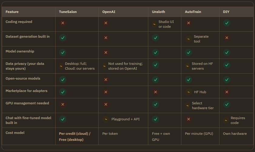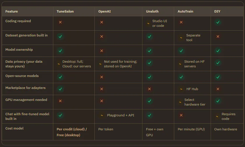 TuneSalon AI is built for people who aren't developers. No code, built-in dataset generator, built-in chat, adapter marketplace, and you own everything you create. Cloud GPUs if you don't have hardware, or the desktop app for complete privacy, fully free and open source.