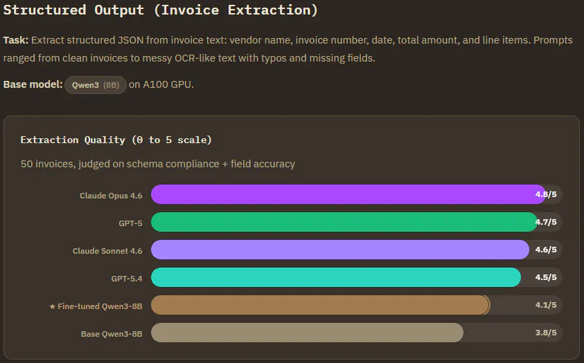 Invoice Extraction (Qwen3-8B) : Frontier still leads here, but the fine-tuned model fixed something that matters in production. The base model kept dumping reasoning text into the JSON output. After finetuning, it never broke schema. It also became more conservative about hallucinating invoice numbers on ambiguous inputs. It would rather leave a field empty than make something up. On clean invoices all models performed nearly identically. The gap only showed on messy OCR inputs with discounts and deposits.