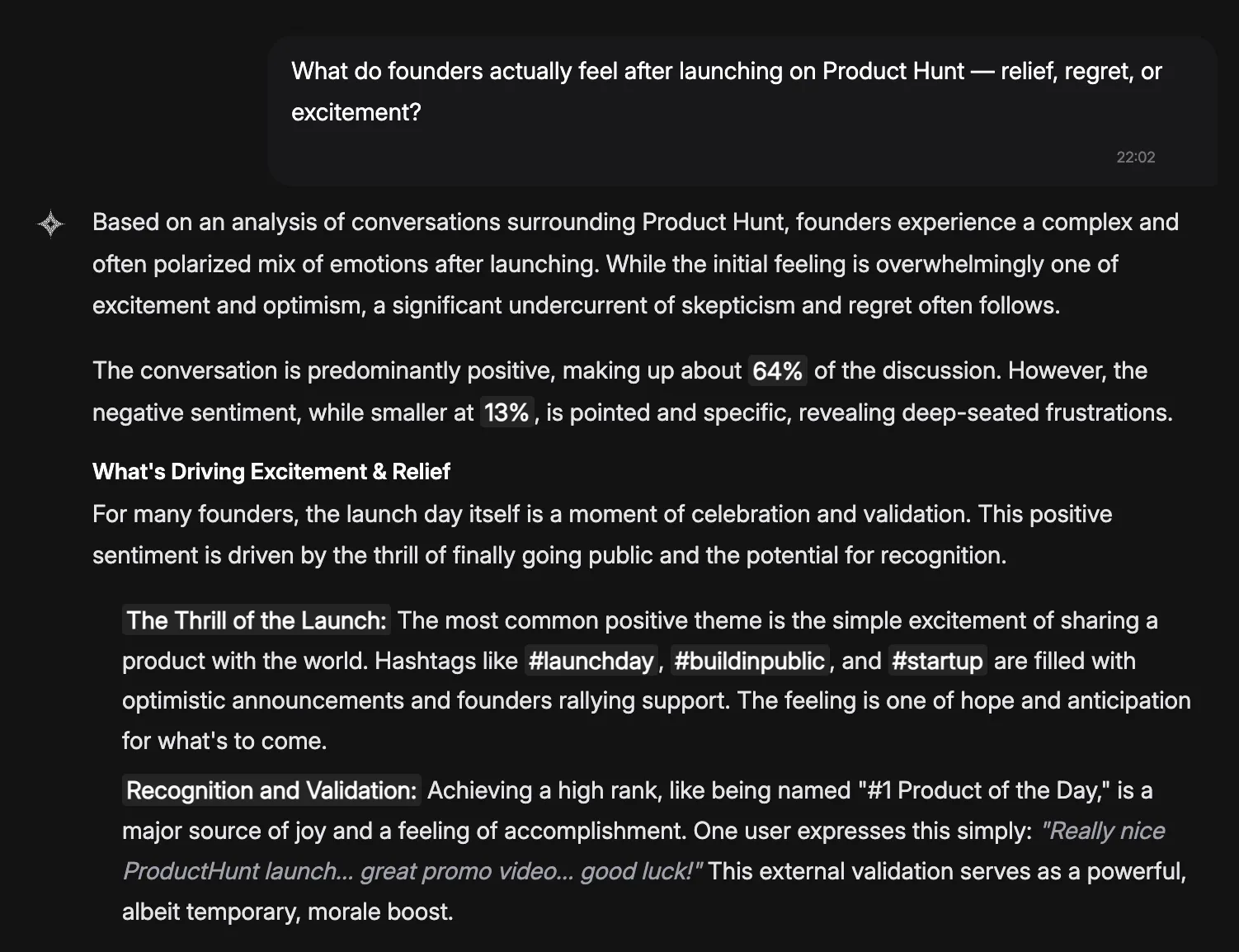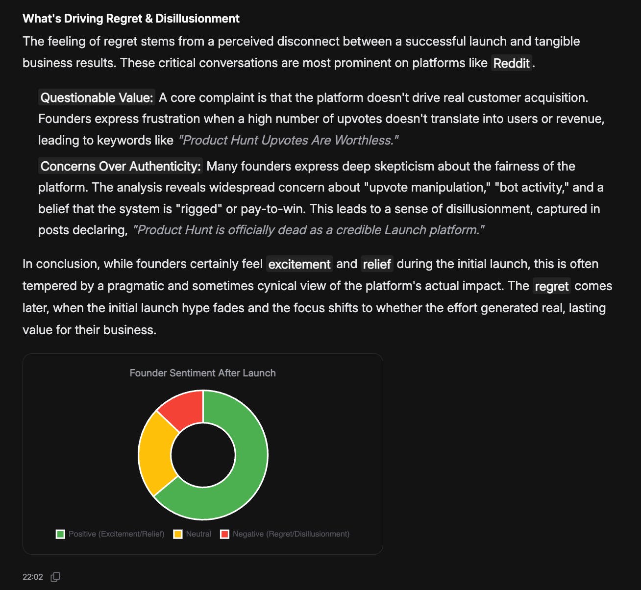 The most honest insight our AI gave us? Excitement is real on launch day. Regret creeps in 48-72 hours later when the traffic doesn't convert.