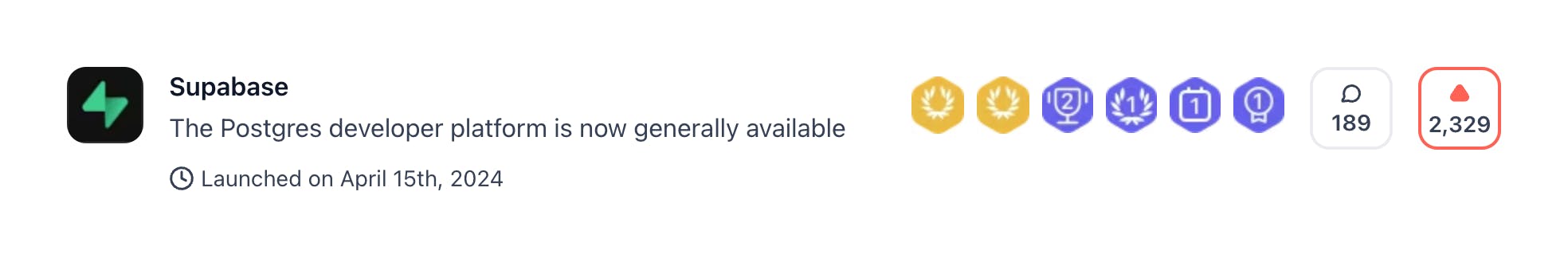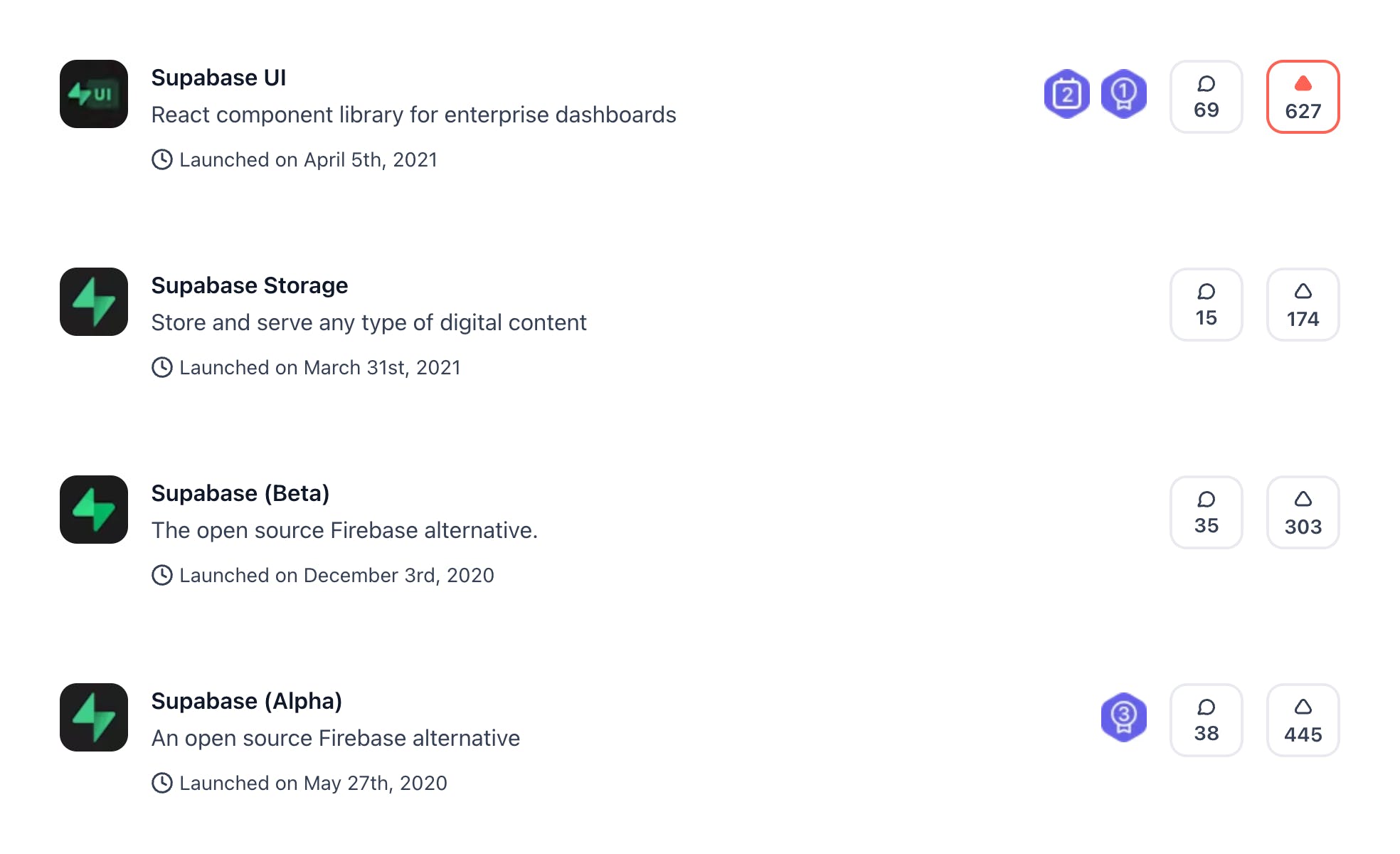 My key takeaways: ProductΒ Hunt definitely is a great place for developer tools. First launched in 2020 as an alpha version, Supabase has kept launching since then, and it paid off. Four years later, they went GA, ranked #1 Product of the Day / Week / Month / Year (runner-up).