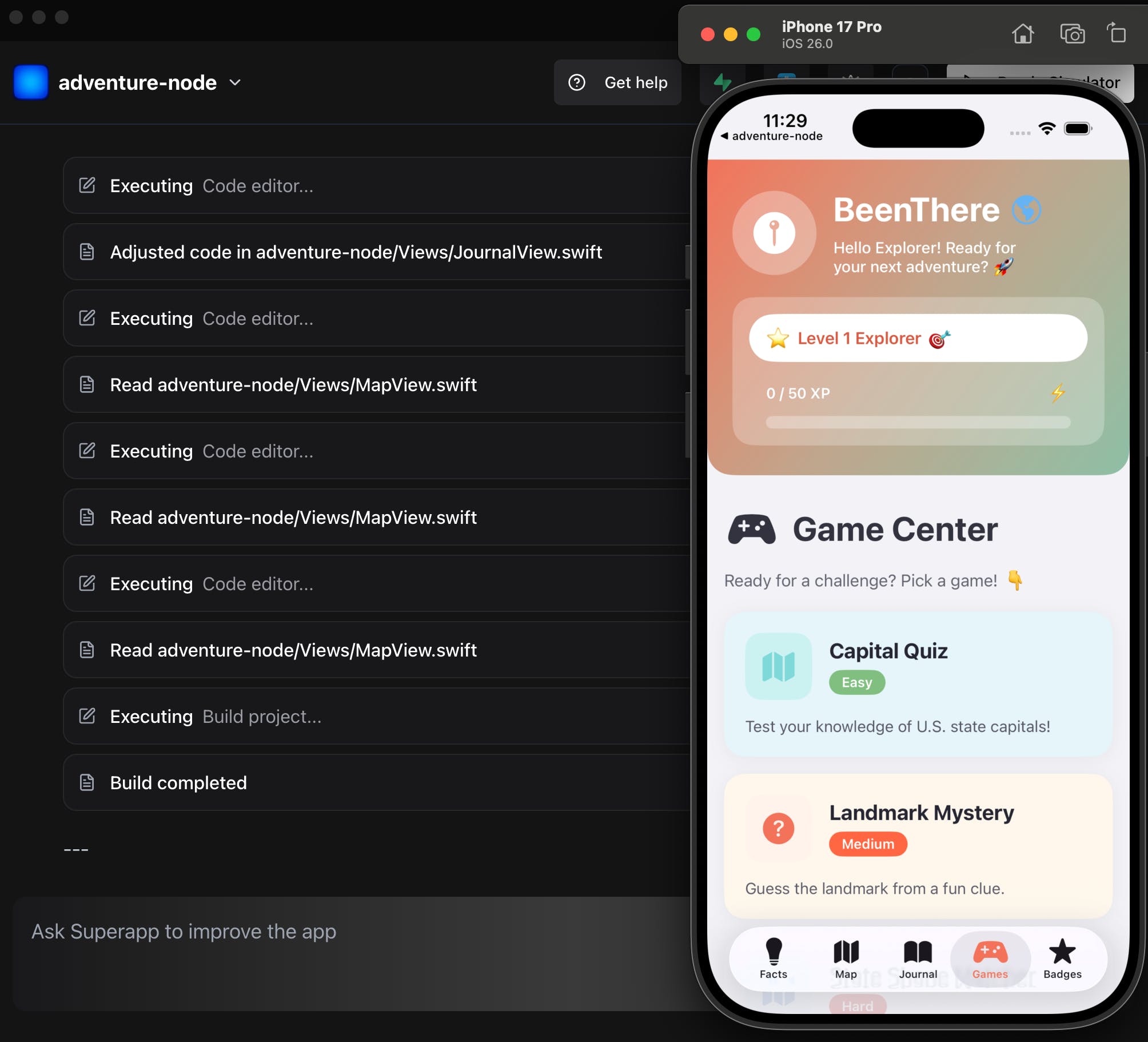 Building out an adventure app: BeenThere. It's a gamified travel companion aimed for the younger crowd and turns exploring the United States into an educational adventure by combining interactive map tracking and journal logging with fun geography challenges and achievement badges.
