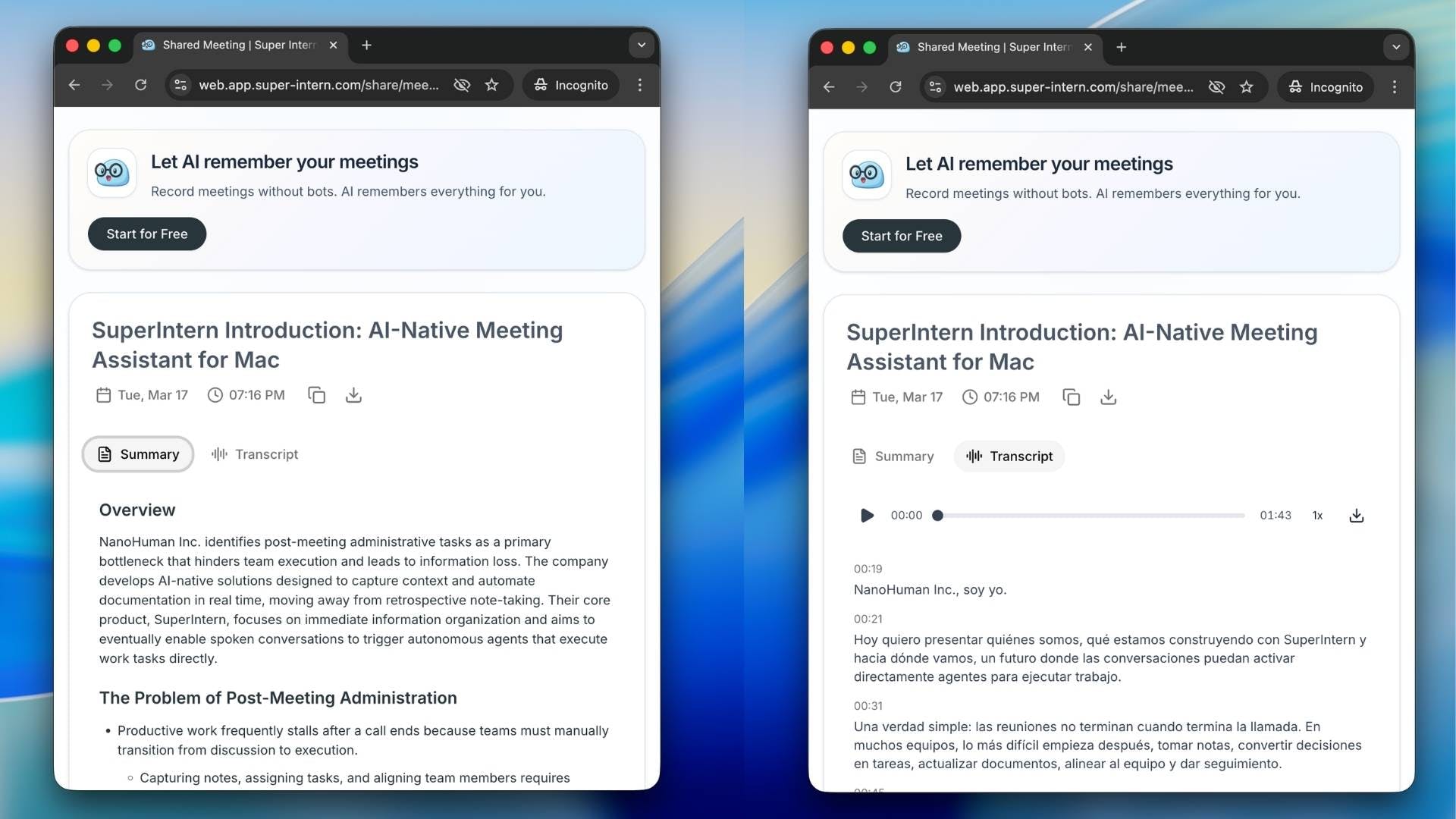 This one's a game-changer for global teams. SuperIntern now auto-detects which language is being spoken and displays both the original and translated text side by side β in real time. Supports 50+ language pairs. No interpreter needed.