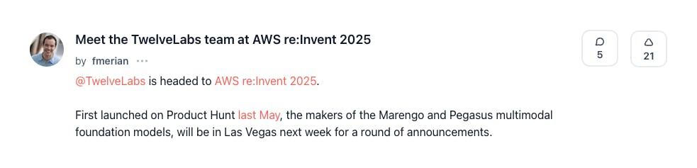This week is AWS re:Invent 2025, the ultimate week for builders, dreamers, and disruptors, and @TwelveLabs has geared up for this event with a series of announcements. [3]