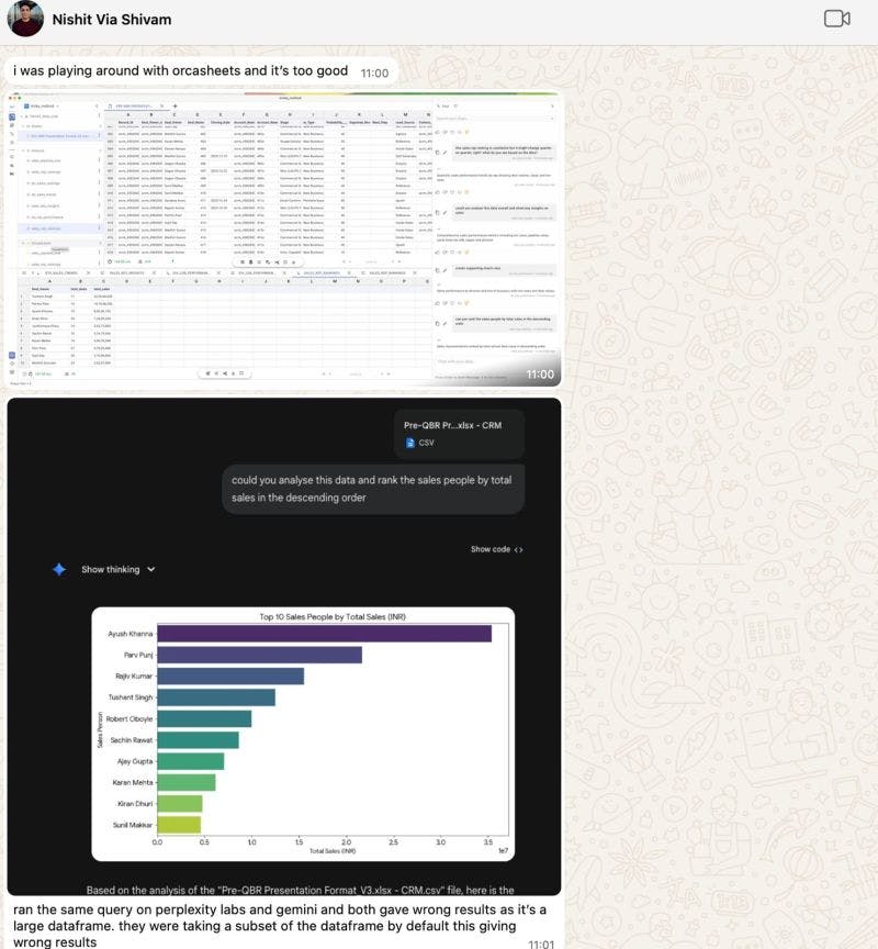 Nishit uploaded a large CRM dataset and asked a simple question: rank salespeople by total sales.