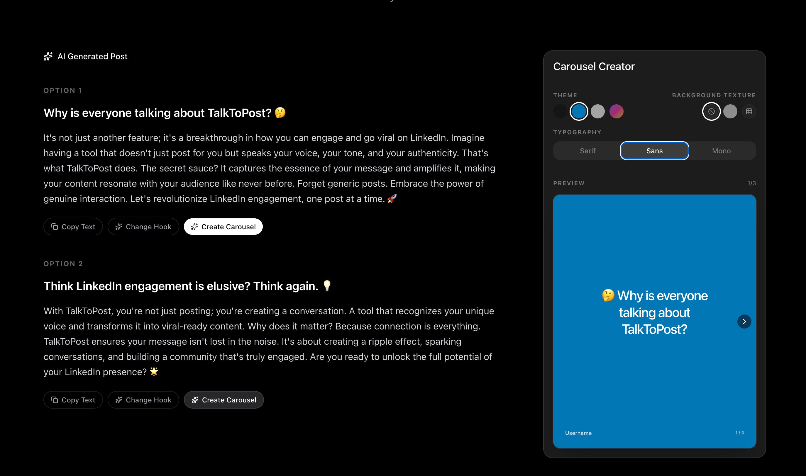 It converts raw voice notes to LinkedIn, X and Reddit viral content. It understands your idea and generate engaging social content instantly, eliminating manual typing and design work since it also auto creates stunning visual carousels!