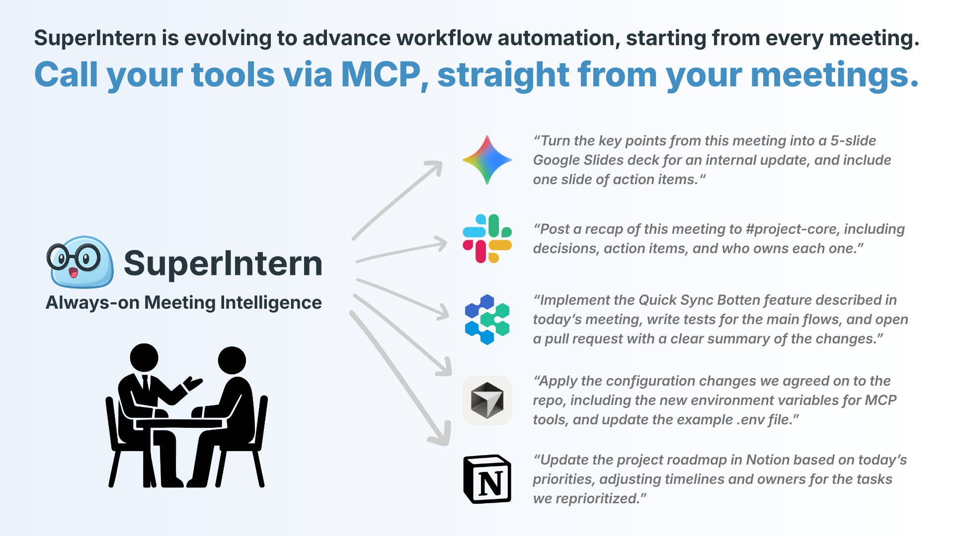 SuperIntern listens to the meeting, understands what people say, and then uses Model Context Protocol (MCP) to orchestrate other tools and agents.