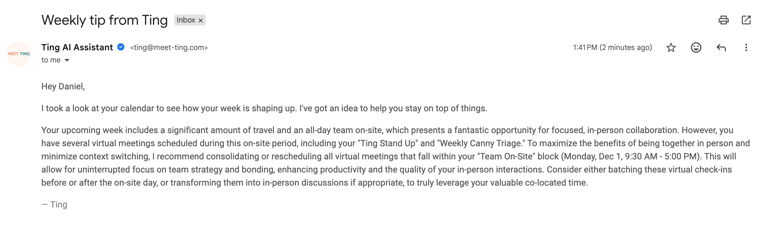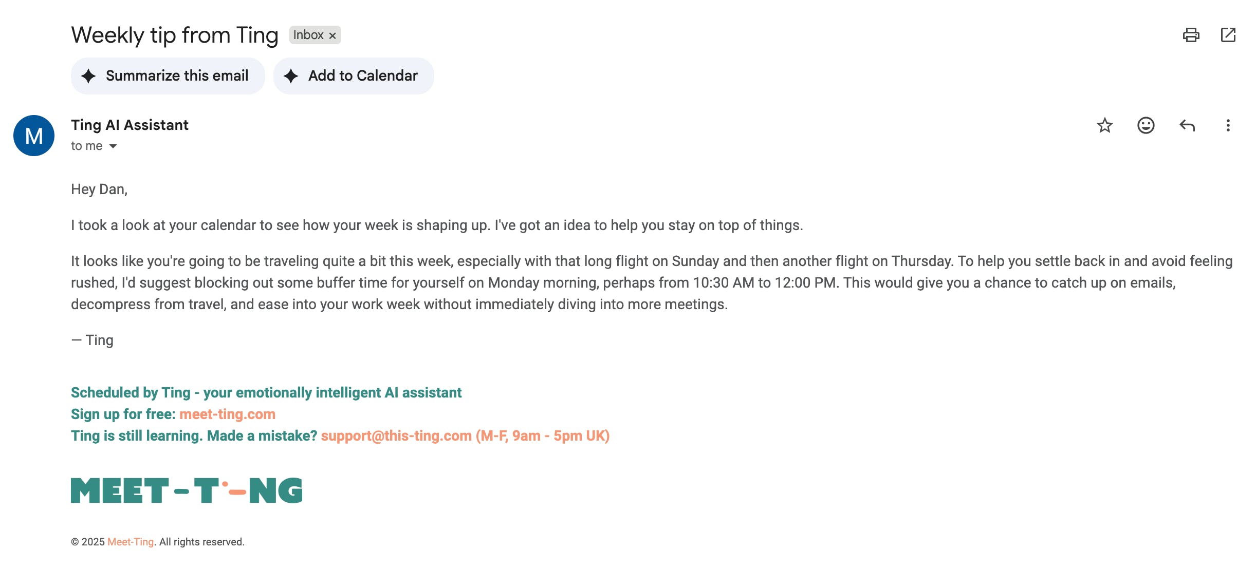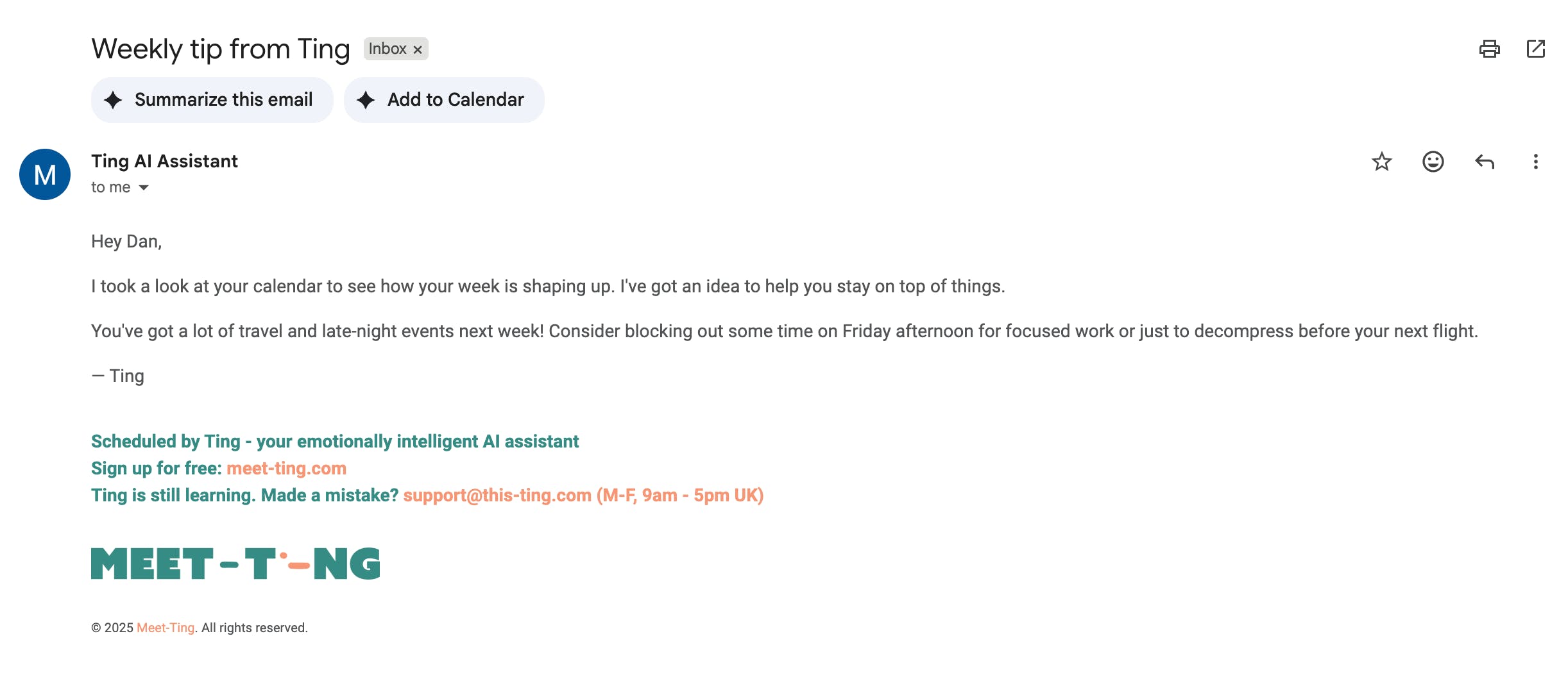 Anyone can look at a calendar and optimise it easily, so we knew we needed to do better = instant insight by looking at all meetings, their format, how many people attending, internal vs. external, and so on. Then Ting can suggest an optimisation to (hopefully) give you back time, energy or reduce stress.