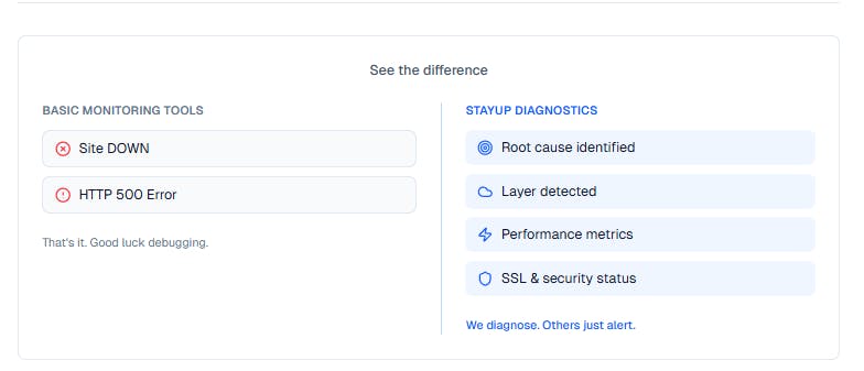 StayUp highlights the layers it detects (origin vs edge vs DNS vs SSL), so now it’s clear what makes it different from basic uptime pings.