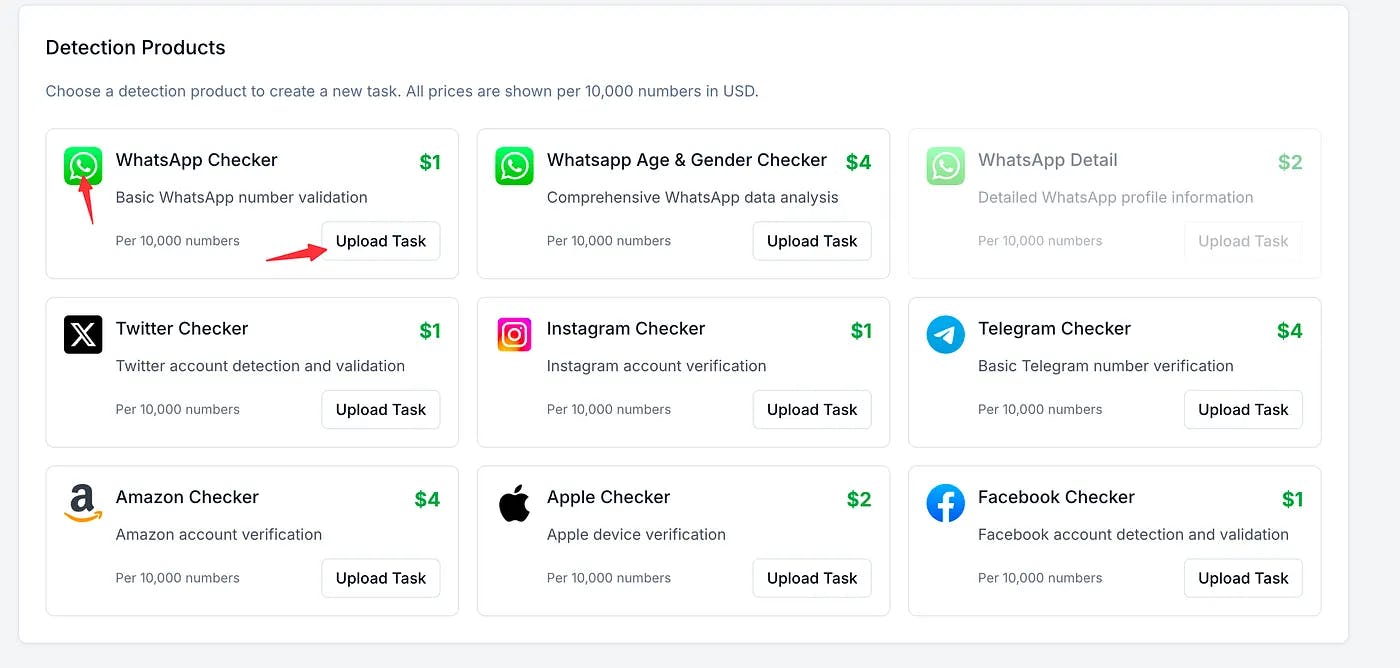 Select Your Mission: Identify the product card that matches your goal. To check for WhatsApp users, for example, find and click the "Upload Task" button on the “WhatsApp Checker” card.