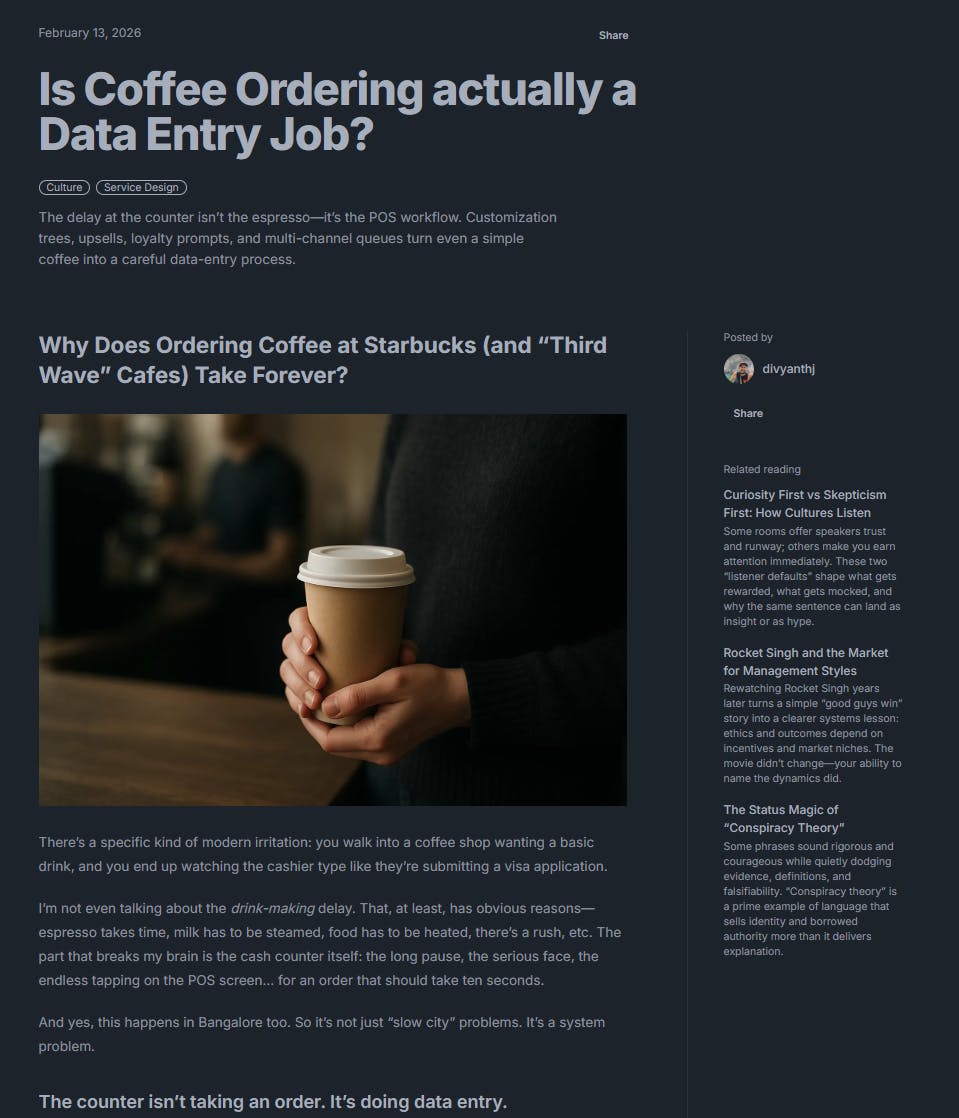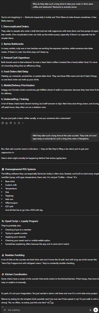 I hate writing, but I think about a lot of things. For example the other day I was wondering why Starbucks barristas take such a long time just to take my coffee order. So I ranted about it to ChatGPT.