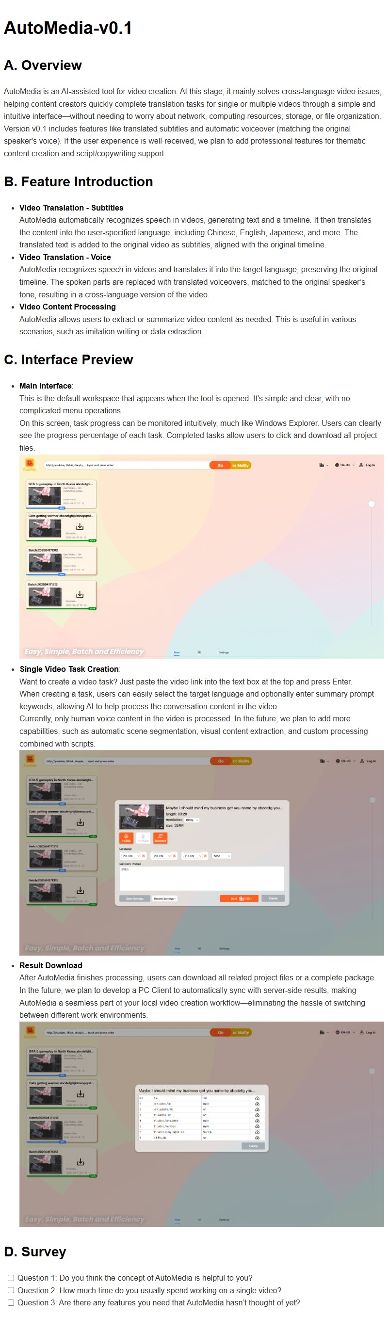 Hello everyone, I am an independent developer who has just started a business. I found that many high-quality content cannot be better disseminated due to language limitations. Now I plan to make an intuitive and simple small application, taking cross-language video translation as the first step, to provide batch and convenient processing tools for video creators.