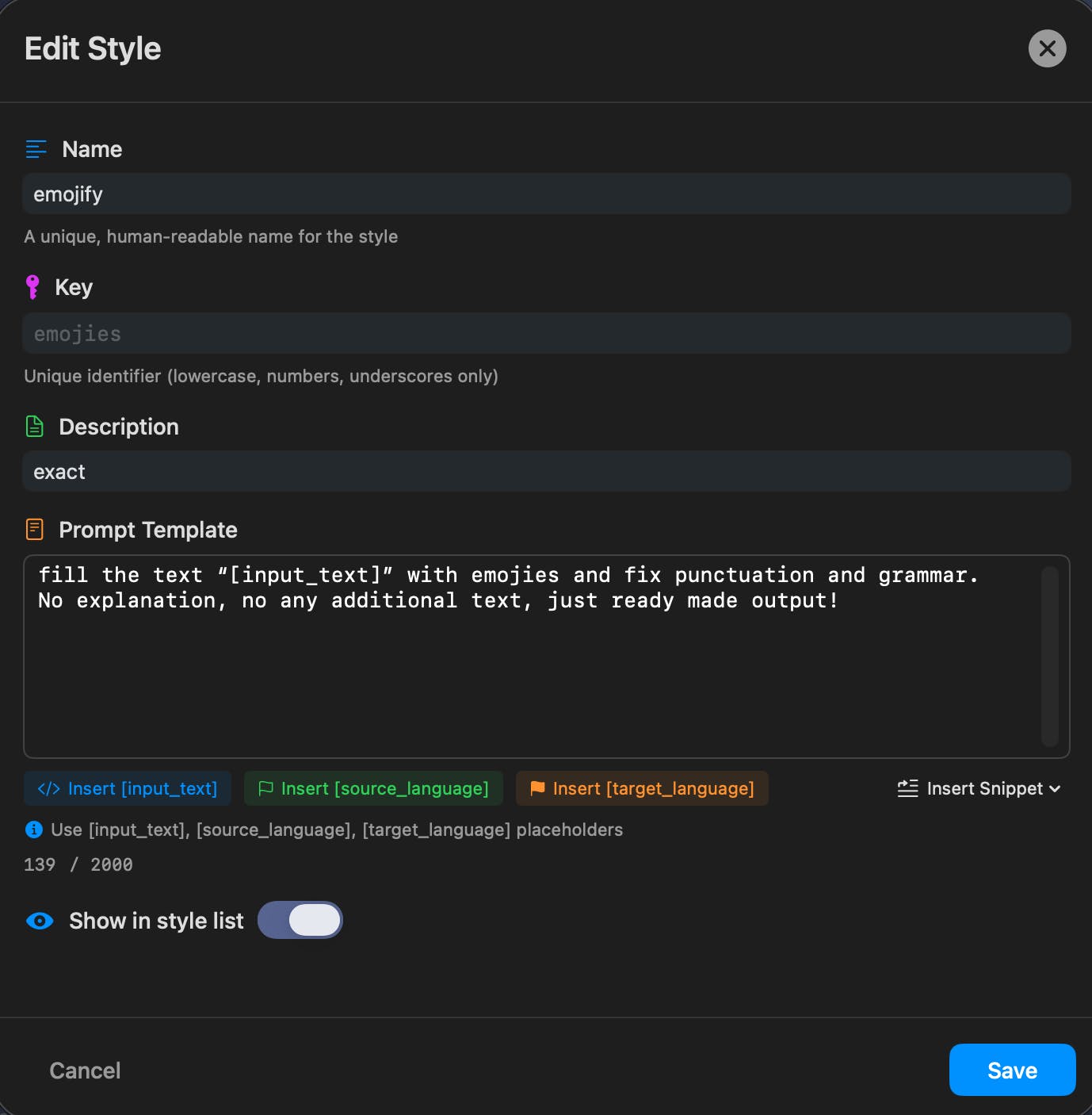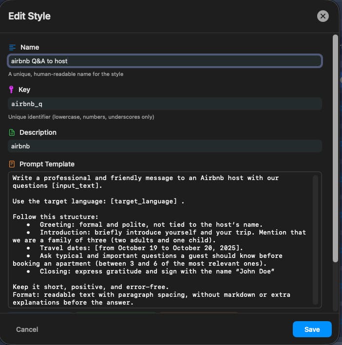 I created a Reply Style template called “Airbnb Q&A to Host” (Settings → Reply Styles → Create new style).