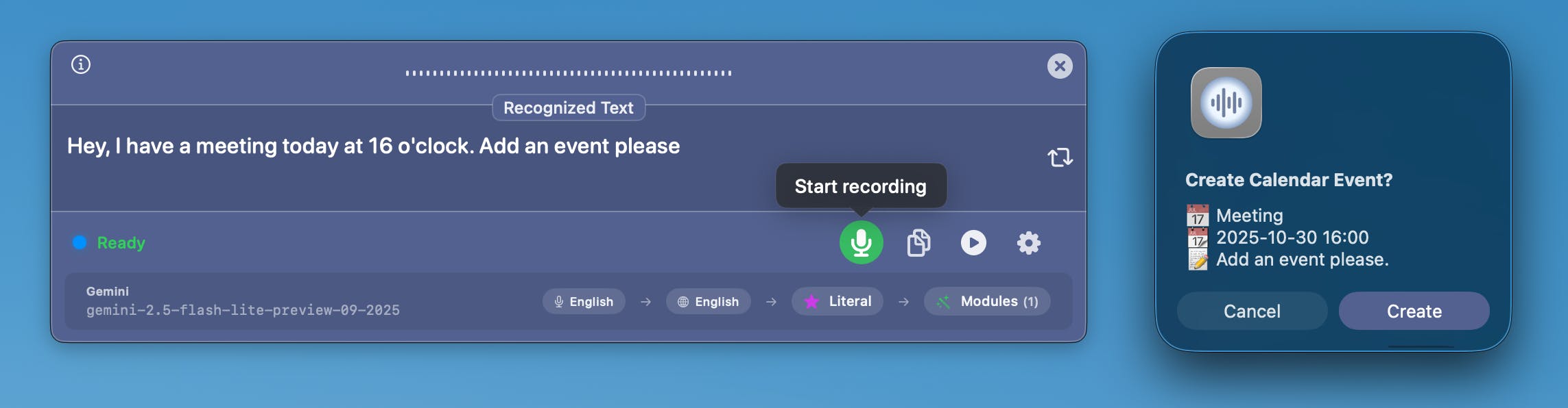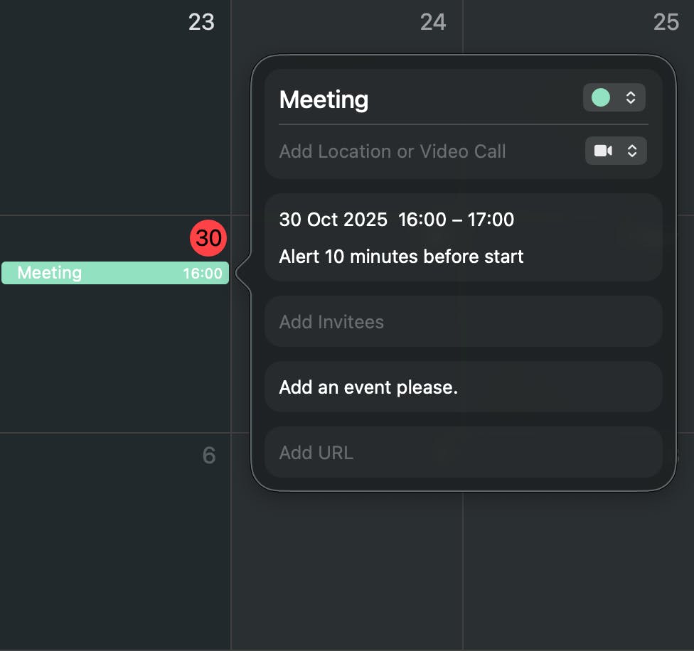 When you say something like: "Hey, I have a meeting today at 16 o'clock. Add an event please"