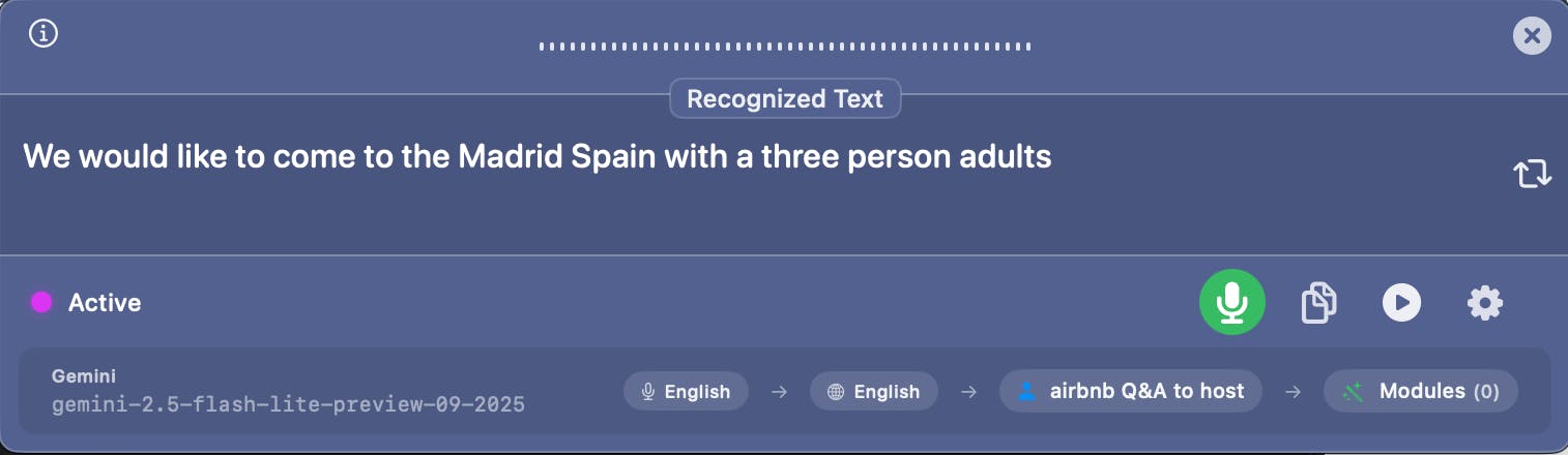 My favorite hotkey for dictation is Ctrl + Space - press once to start, press again to stop. After that, VoiSistant generated this super-useful message for the Airbnb host: