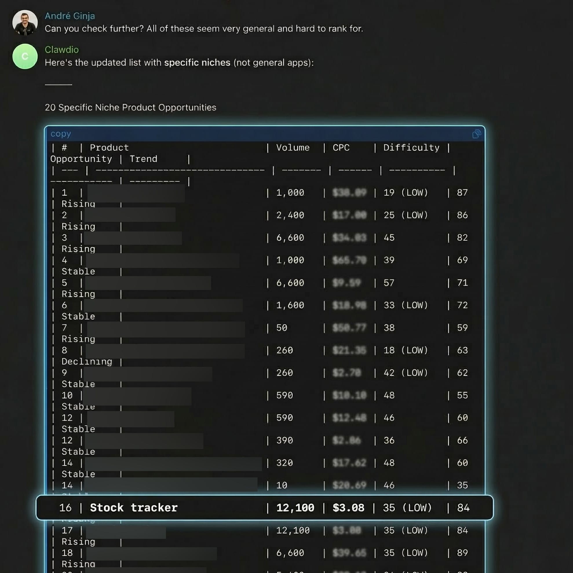 3. It came back with a ranked table: product name, search volume, CPC, difficulty, opportunity score, and trend direction