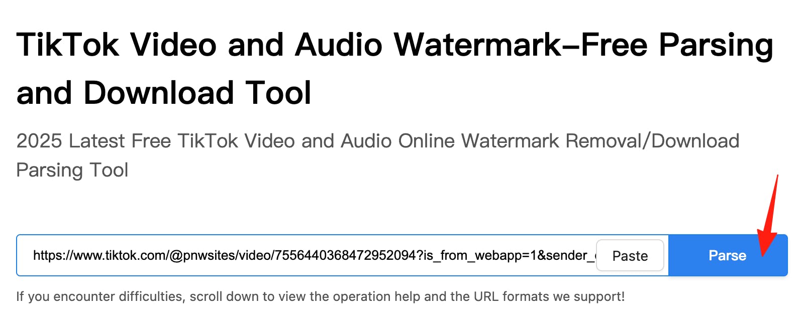 Paste the copied TikTok link into the input box and click the parse button.