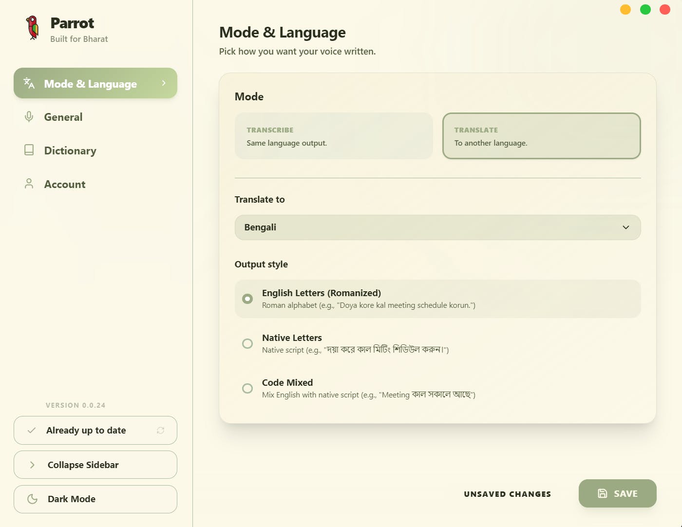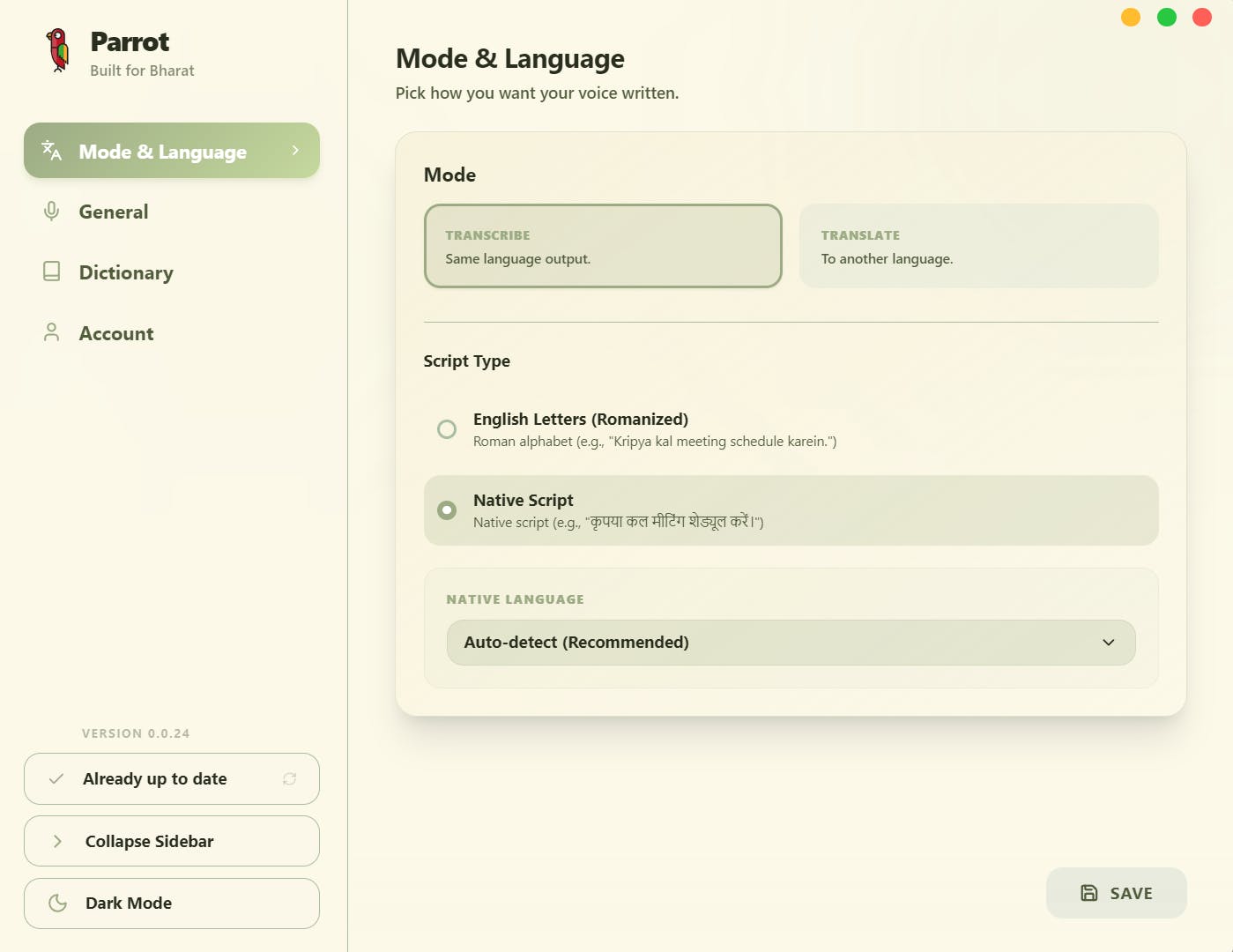 Parrot transcribes and translates speech in 11+ Indian languages. The difference: it's significantly more accurate than Whisper on Hindi, Tamil, Telugu, Bengali, and handles code-mixed speech (Hinglish, etc.) naturally. Outputs in native scripts (নমস্কার not "nomoshkar") or Romanized.