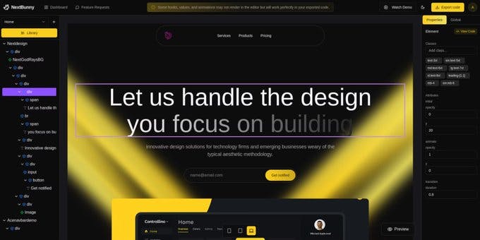 When you're finished, simply export the complete NextJS project and host it anywhere. Say goodbye to copying and pasting components into your local projects when you can visually design everything in one place.
