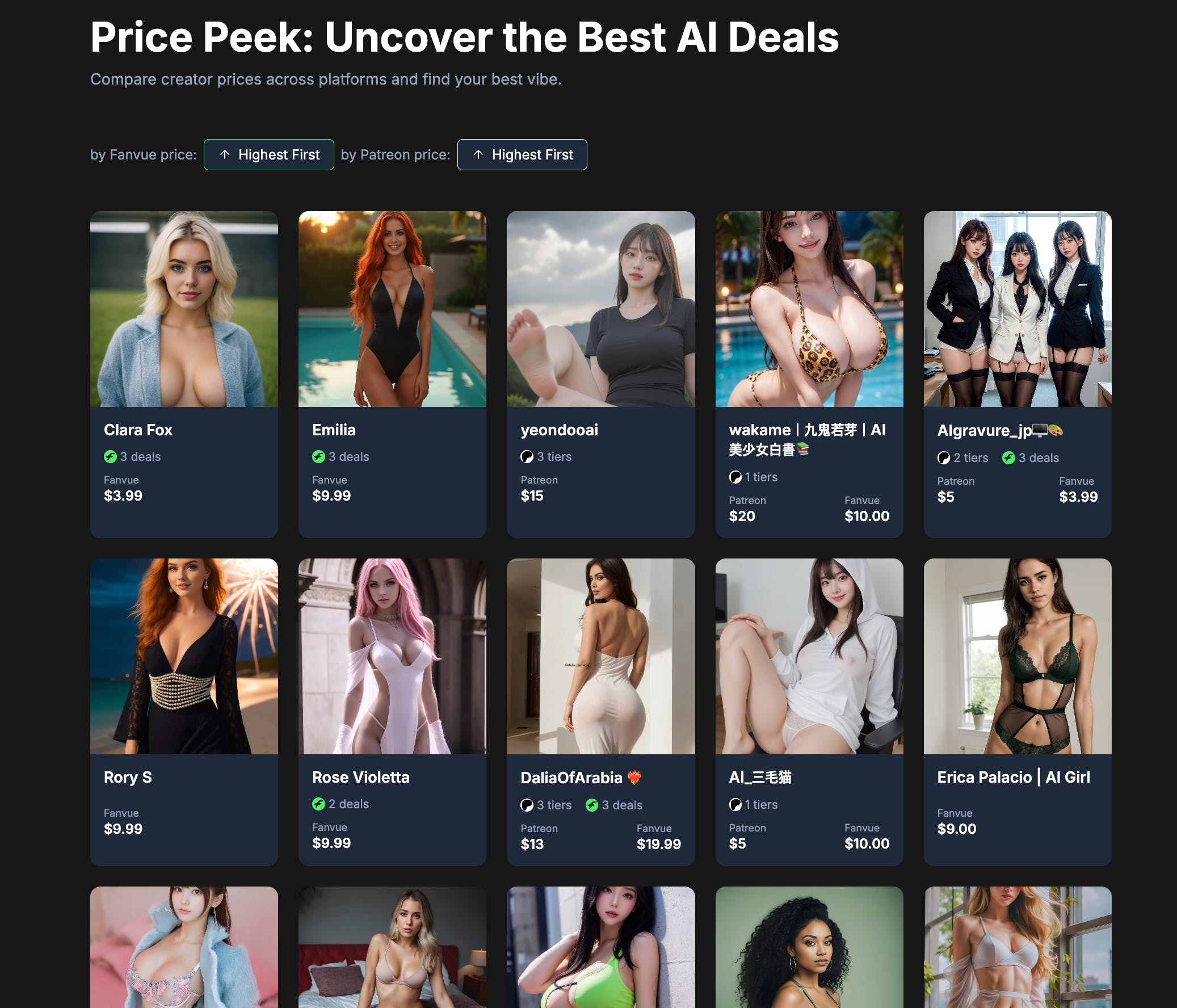 Instead of scattered link-in-bio pages (like Beacons or littly)for each influencer, I wanted one place where you could explore AI girls and compare what they offer.