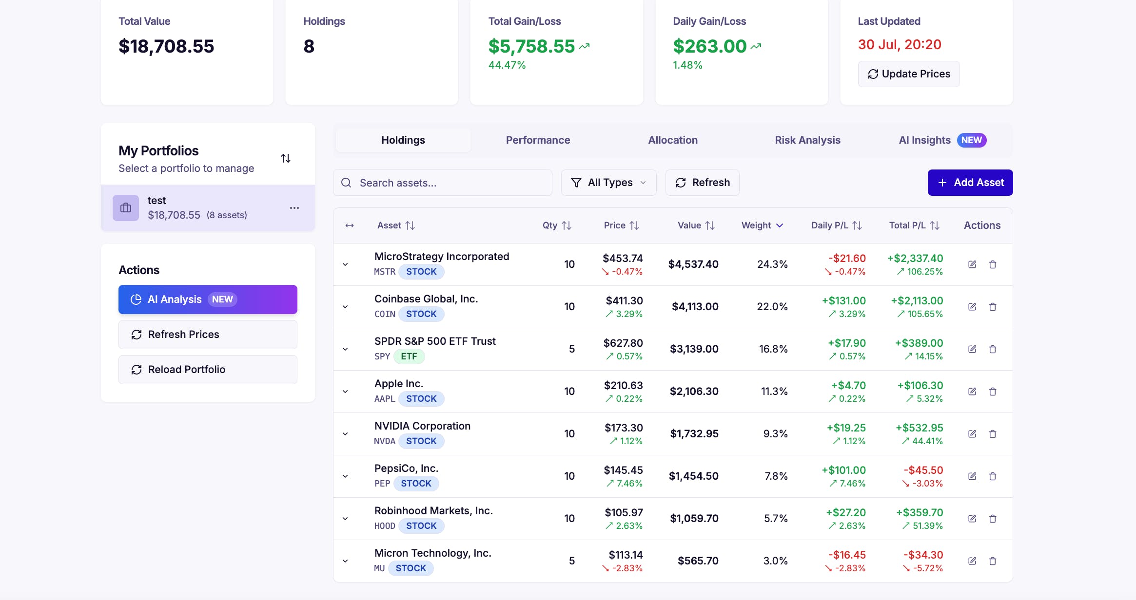 Managing multiple assets can be overwhelming. Our AI Portfolio Manager brings institution-grade analysis to retail investors and traders—so you can invest smarter, not harder.
