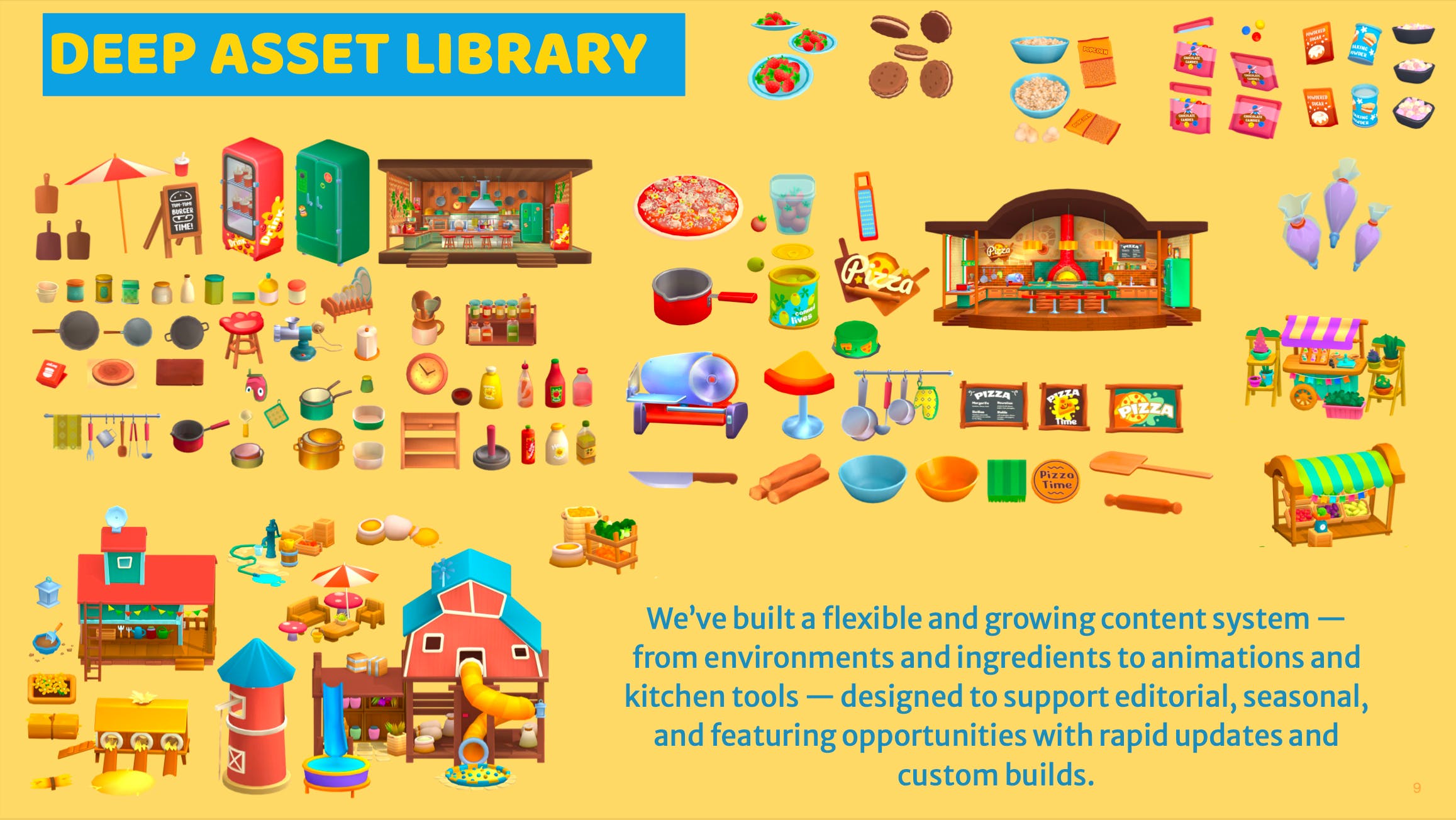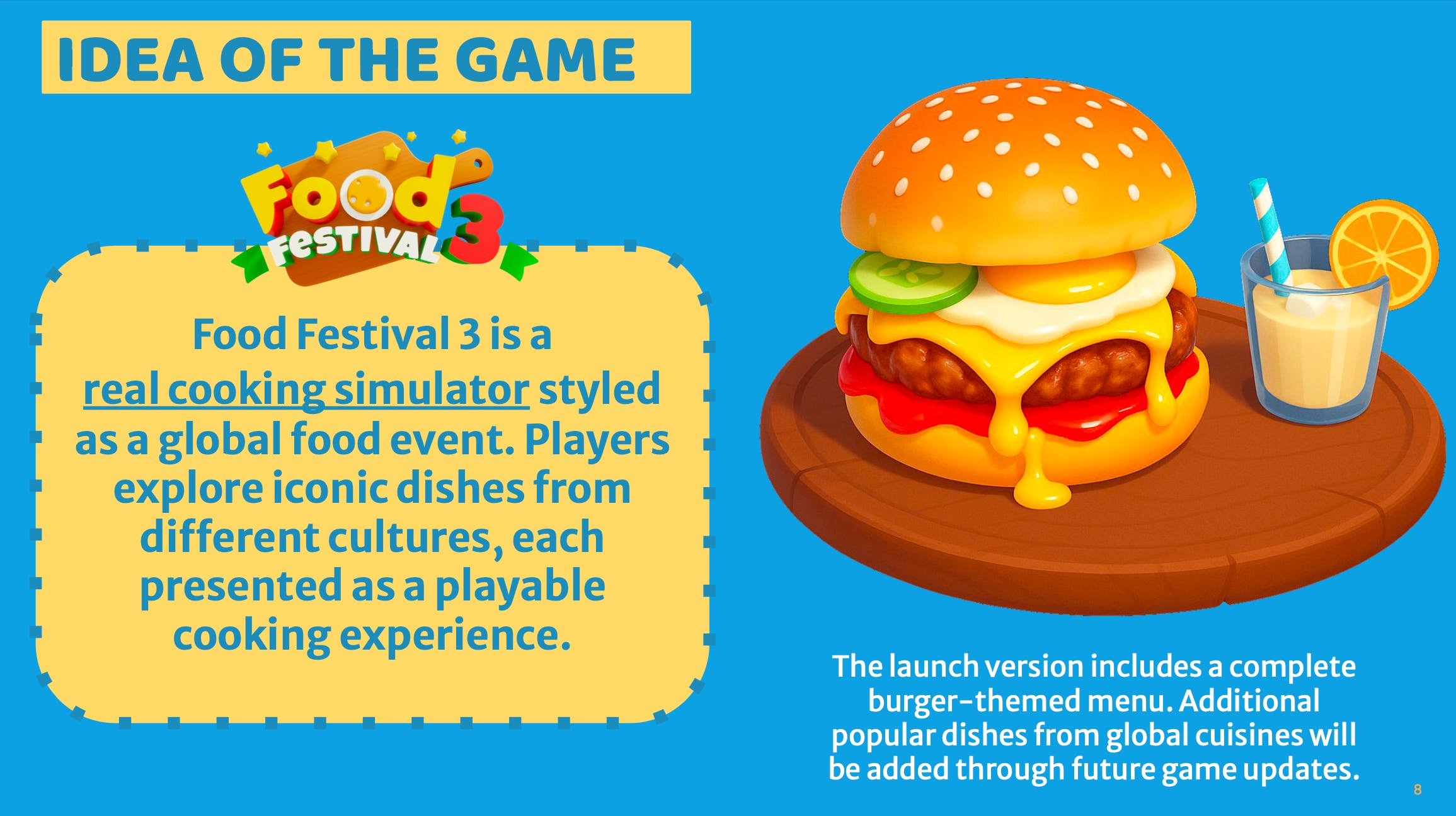Food Festival 3 bridges the best of educational games and animated storytelling to build stronger emotional connections, higher replay value, and an experience people will want to revisit β just like a beloved cartoon series.