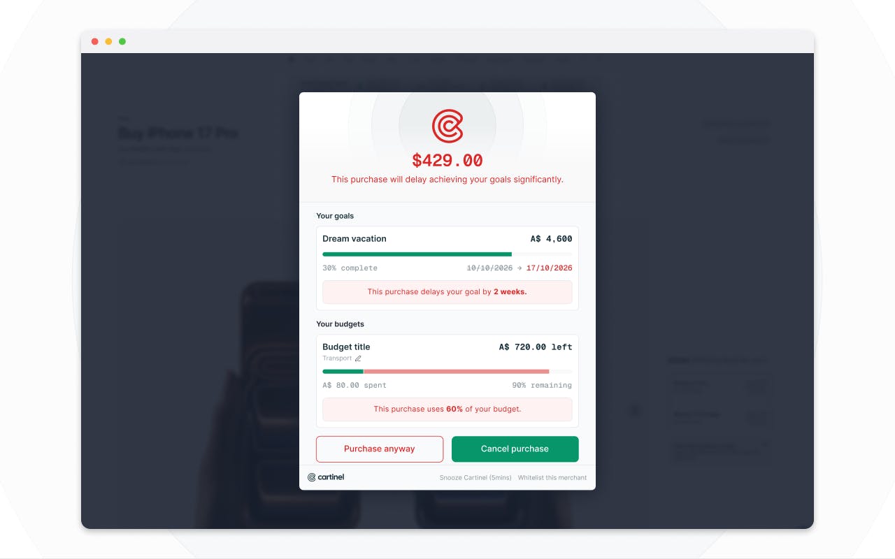 Cartinel is a browser extension (Chrome & Firefox) that gently interrupts you before you complete a purchase. It's not about guilt or blocking you – it's about giving you a moment to pause and ask yourself: "Does this align with my goals right now?"