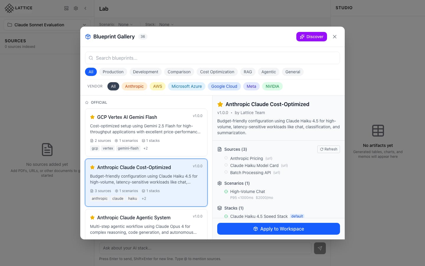 Lattice is an agentic AI lab assistant for research engineers, platform leads, and CTOs. It continuously reads and synthesizes pricing, model cards, benchmarks, and vendor docs to turn weeks of manual research into minutes, delivering grounded AI infrastructure recommendations with full citations.