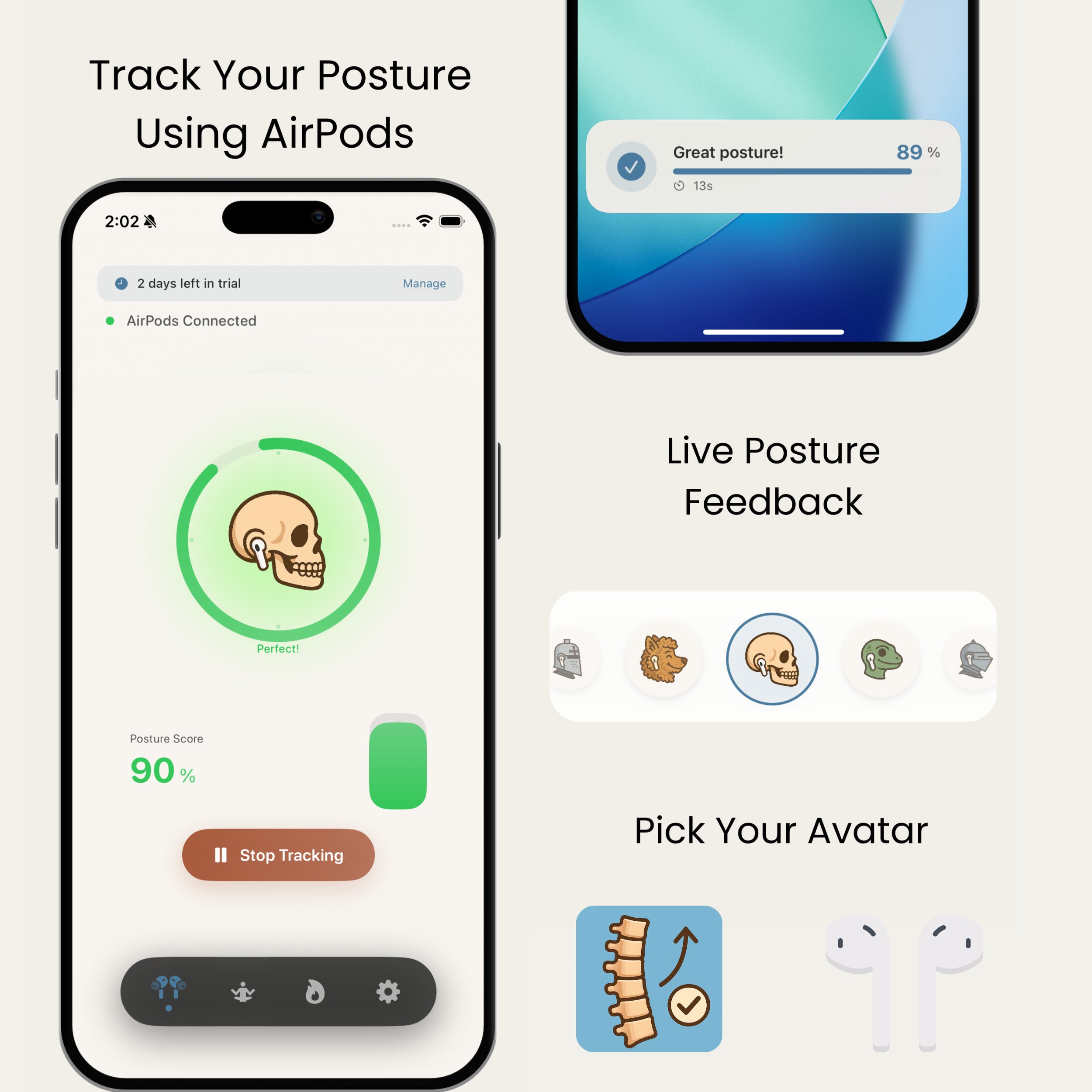 • Real-time posture feedback via AirPods (no straps or cameras)