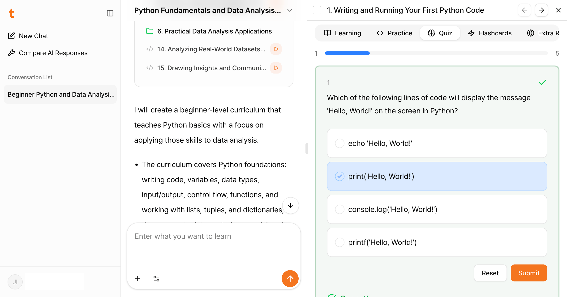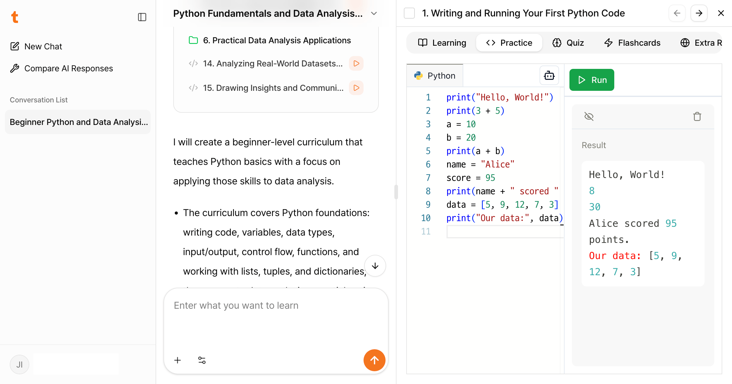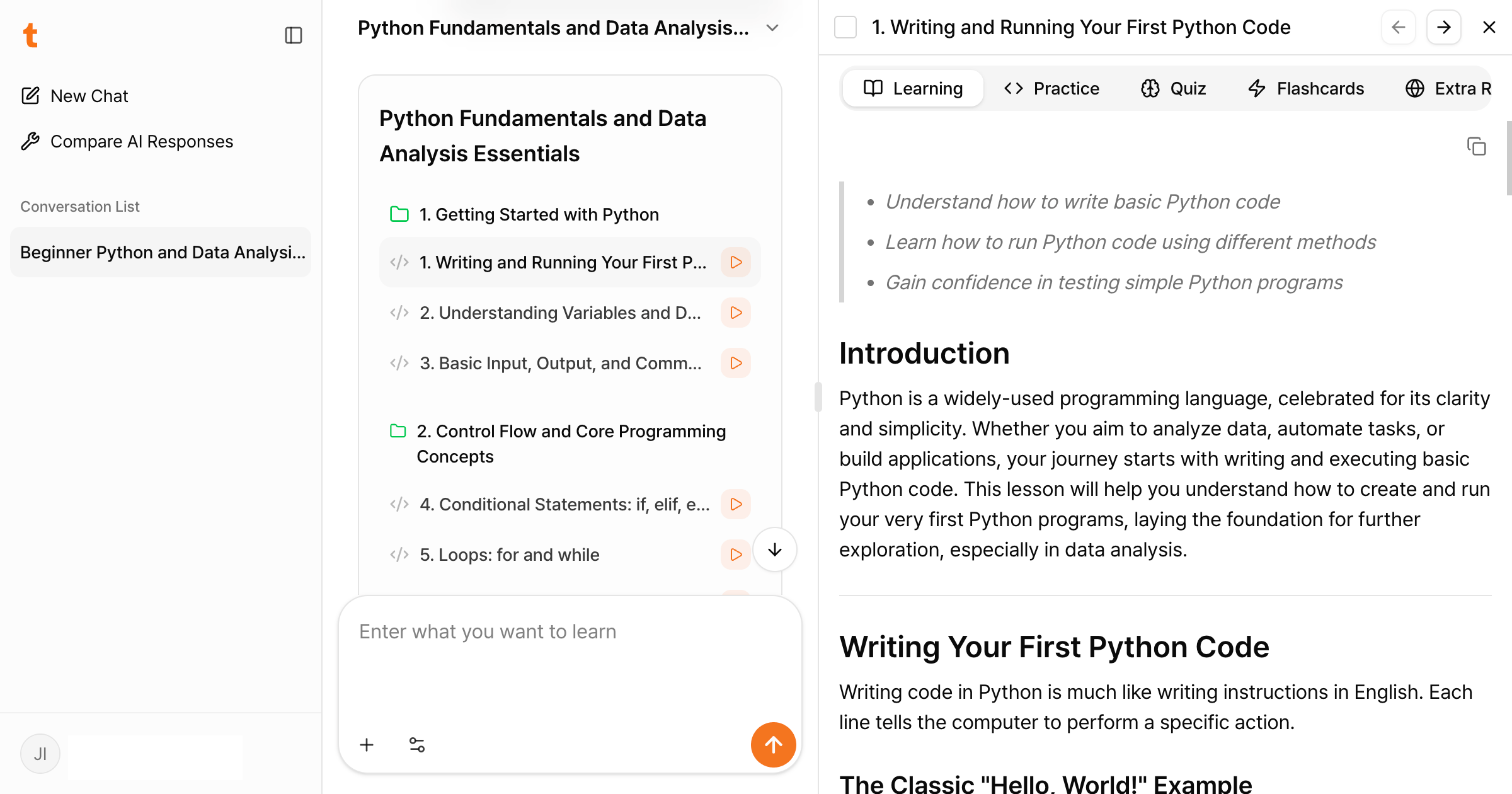 TutorCampus turns prompts into step-by-step, practice-driven lessons. It teaches coding, AI, and a wide range of other topics with instant feedback, real-time code execution, and auto-generated quizzes. You learn by doing, not by watching.