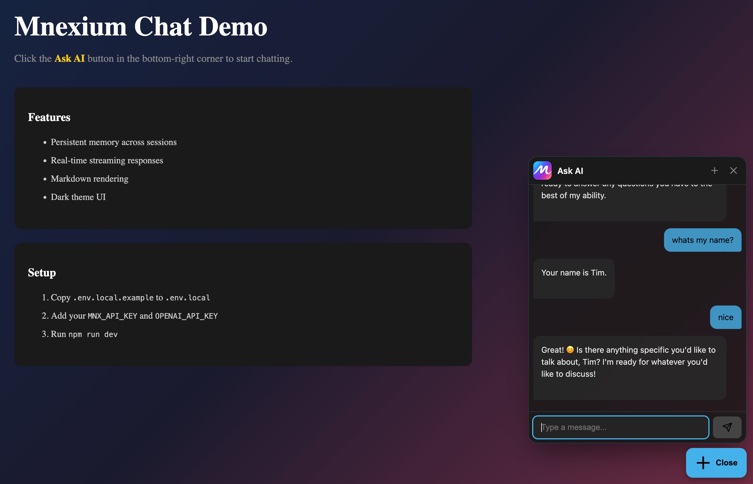 We just shipped @mnexium/chat: a single npm package that adds a polished, production-ready AI chat widget to any website. React, Next.js, Express, or plain HTML — it just works, and most importantly it remembers.