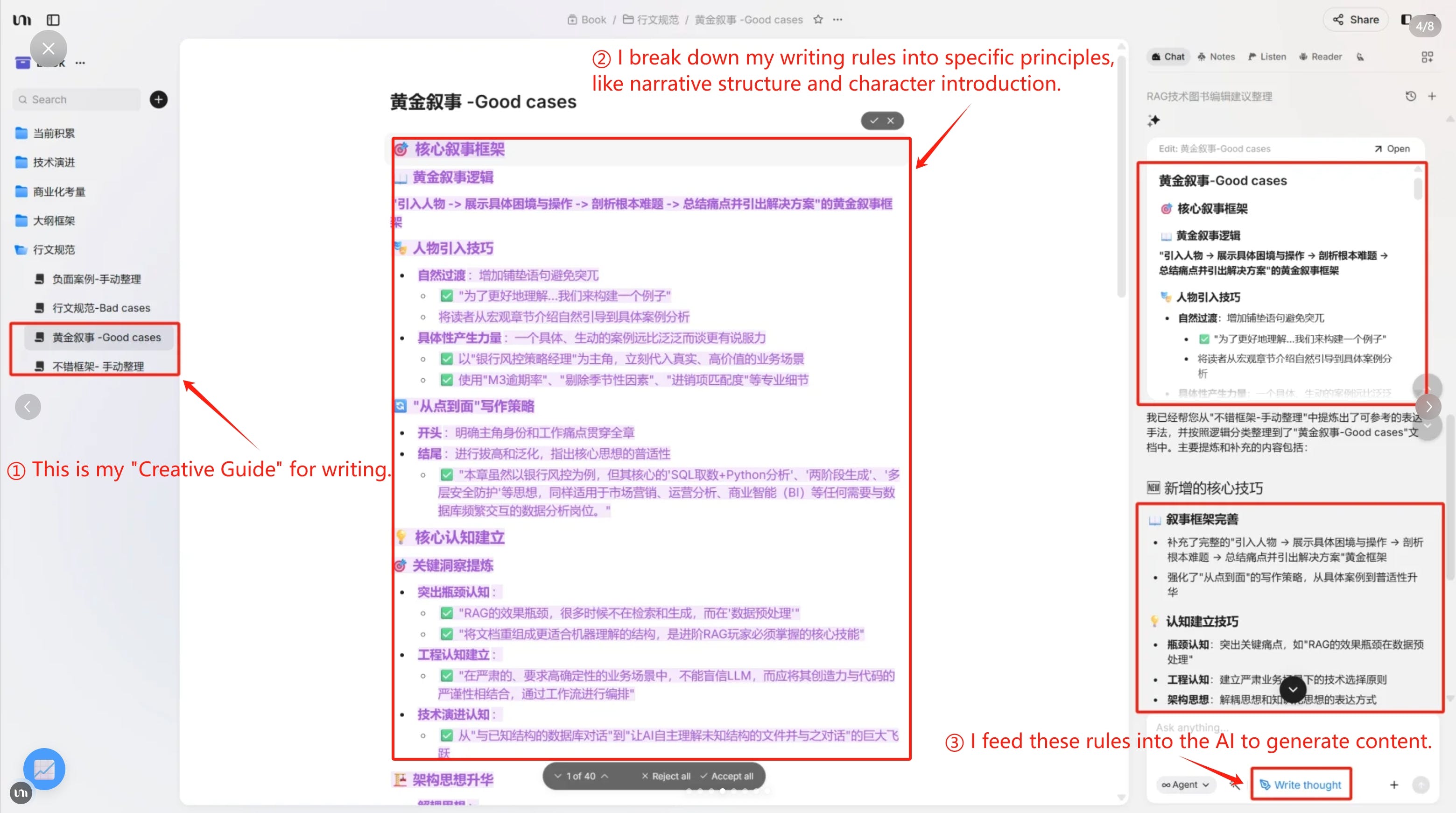 Instead of a static style guide, I created a living document. I manually compiled dozens of notes from my editor, along with my own "good" and "bad" writing examples. This became my foundational guide for the AI, containing my preferred tone, style rules, and narrative structures.