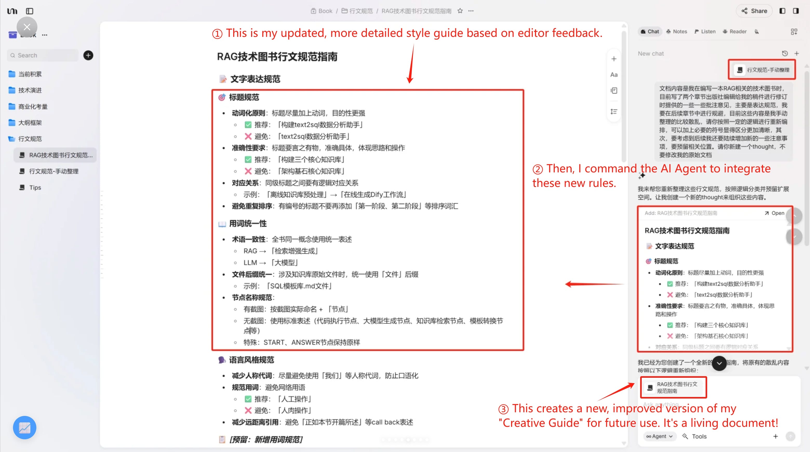 This is key. After finishing each chapter and getting feedback, I create a separate "thought" document to summarize all the new revision ideas. Then, I use the Agent mode again to merge these new insights back into my main "Creative Guide." This way, my writing standard dynamically evolves and improves with every chapter I complete.