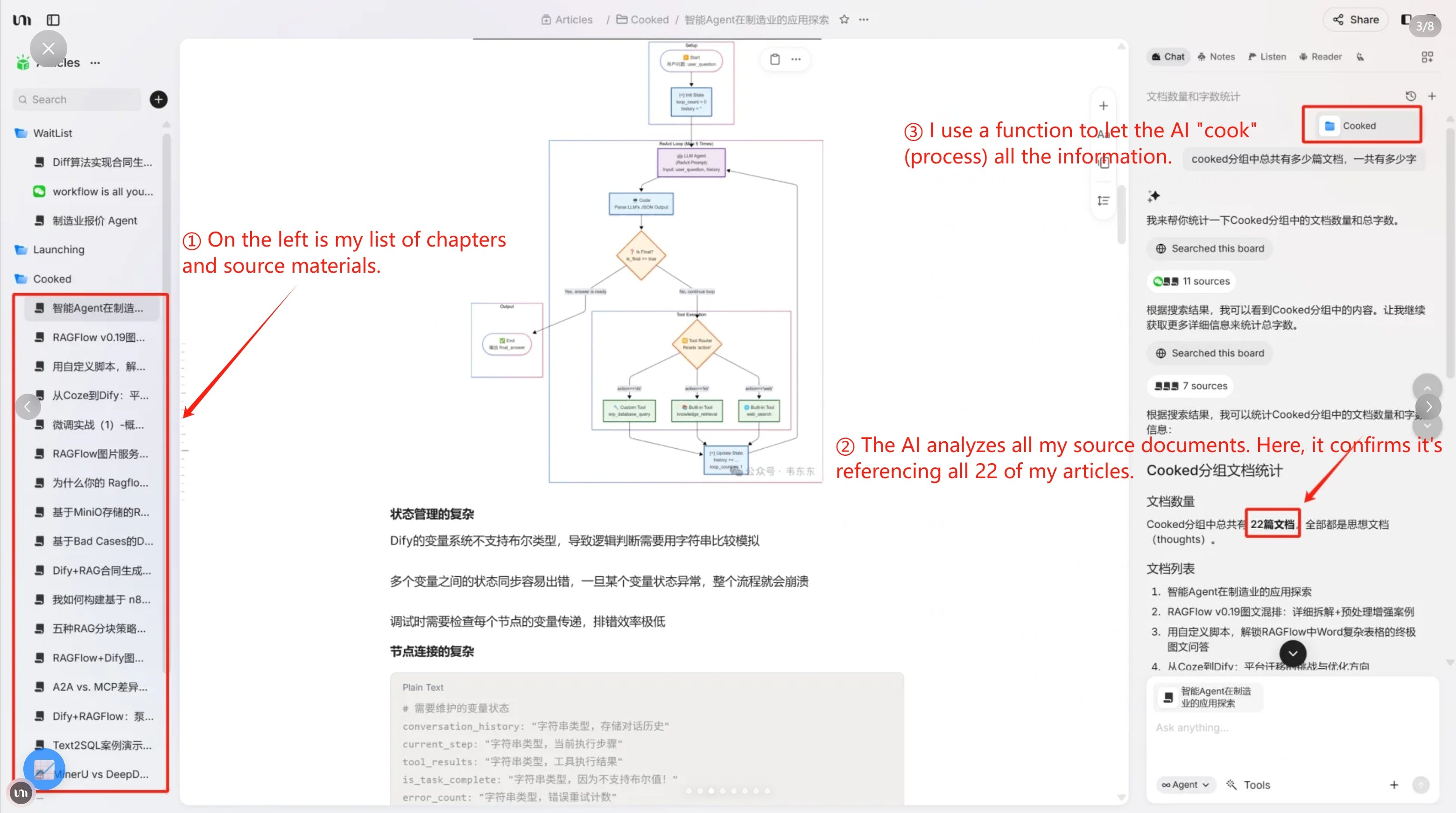 Topic Selection → Import reference docs into a "Group" → Manually outline key points in a "Thought" → Use the AI Agent to expand and polish the draft → Manually edit and finalize.