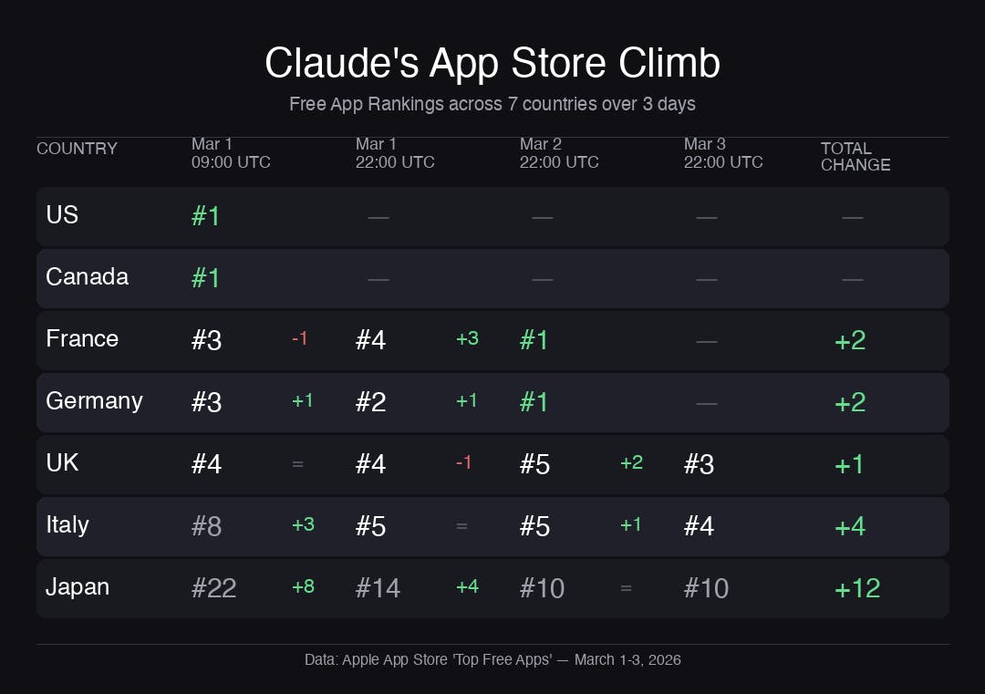 Mar 2 22:00 UTC: France and Germany both hit #1! Japan climbing steadily from #22 β #14 β #10. The world is catching on.
