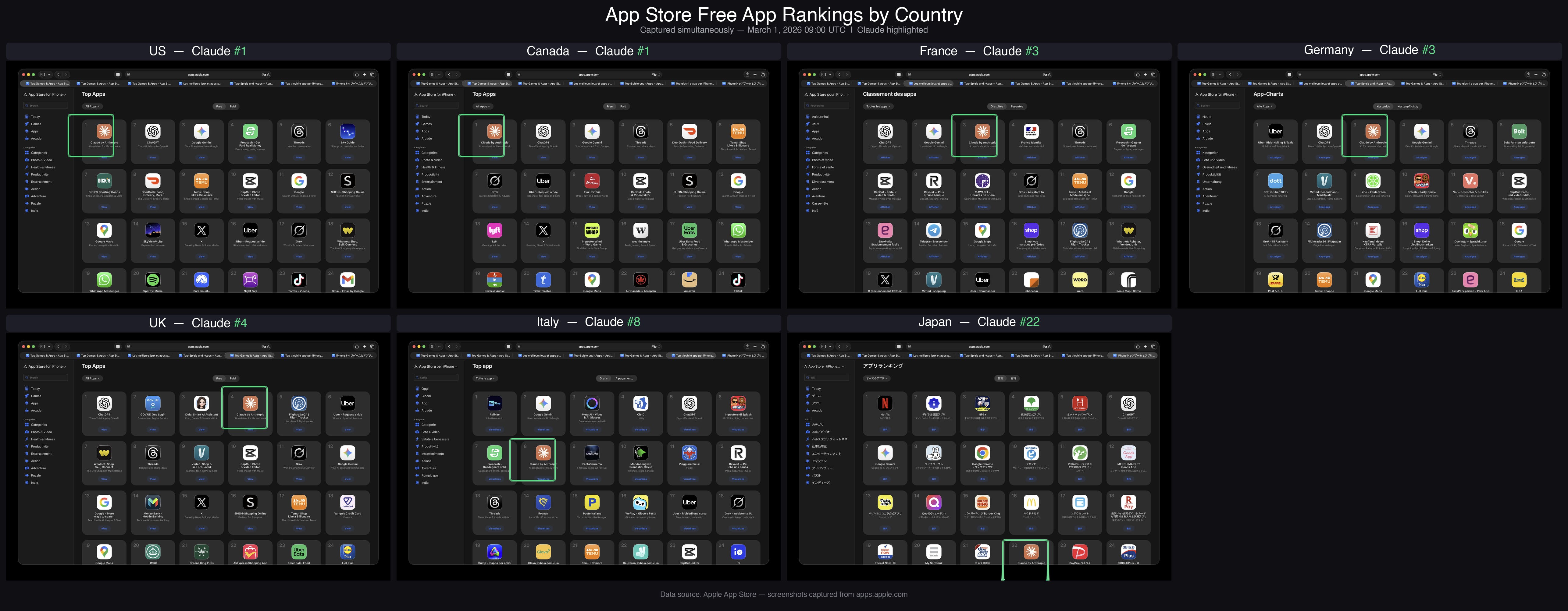 I took screenshots of the App Store's Top Free Apps ranking across 7 countries at the exact same time (March 1, 2026, 09:00 UTC) to compare AI app adoption.