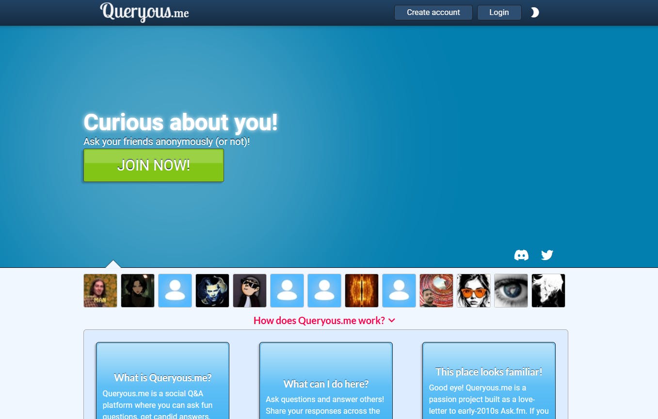Queryous (Query + Curious) is a Q&A social media platform built in the style of Ask.fm 2013, where you ask people questions and answer those you receive back, now with new features like private accounts to protect our users. We launched April 1st of this year after some periods of beta testing and we already have a nice little chill community of daily active users.