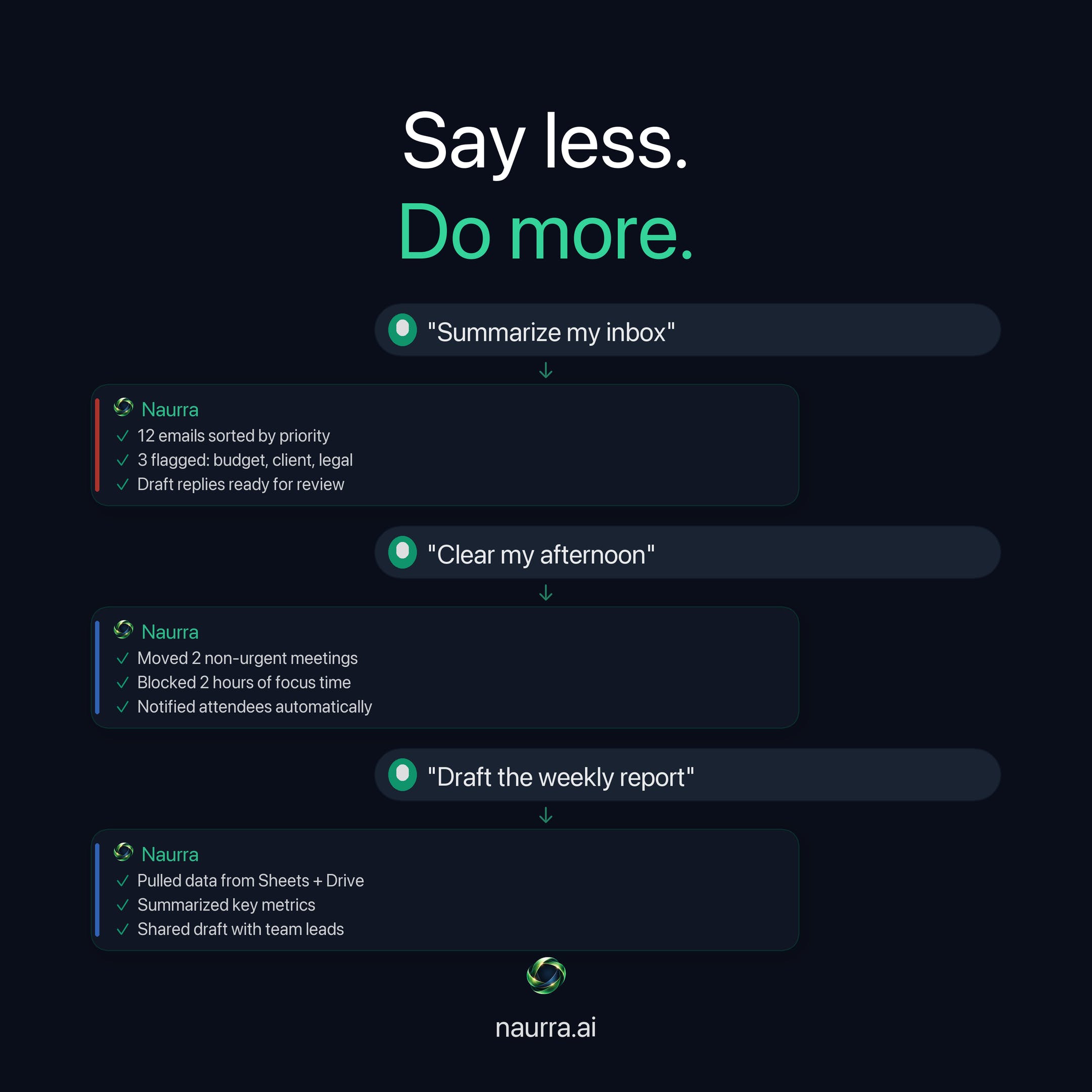 Three words. Three tasks done. Just tell Naurra.ai what you need, emails, calendar, reports, handled instantly.