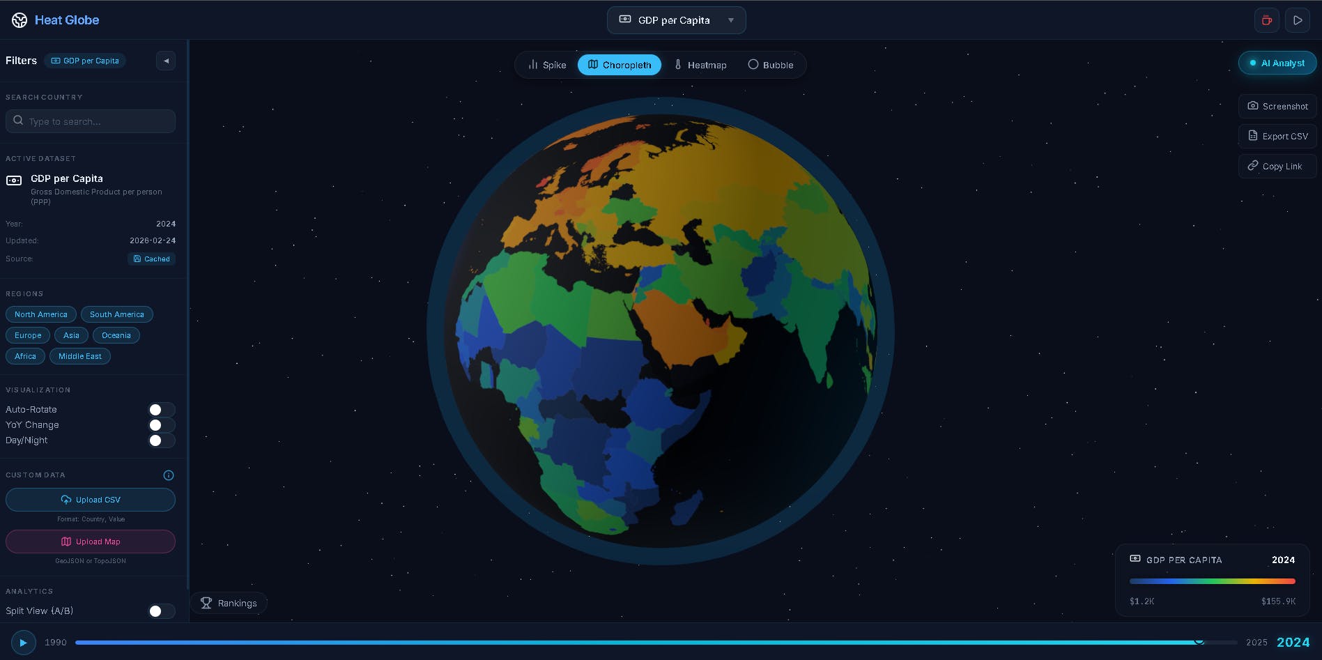 I'm incredibly excited to share Heat Globe, a project I've been building to make exploring global data beautiful, interactive, and insightful.
