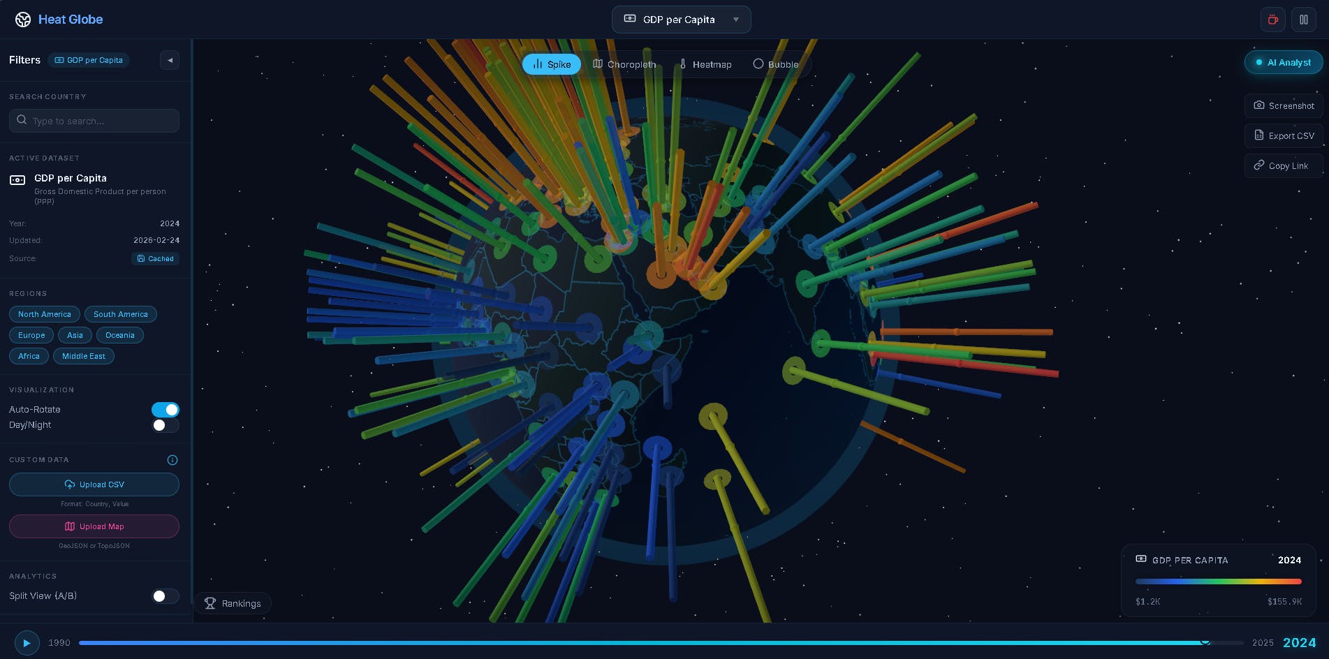 Multiple Visualization Modes: Switch seamlessly between Choropleth, 3D Spikes, Bubble overlays, and Heatmaps to find the best way to represent your data.