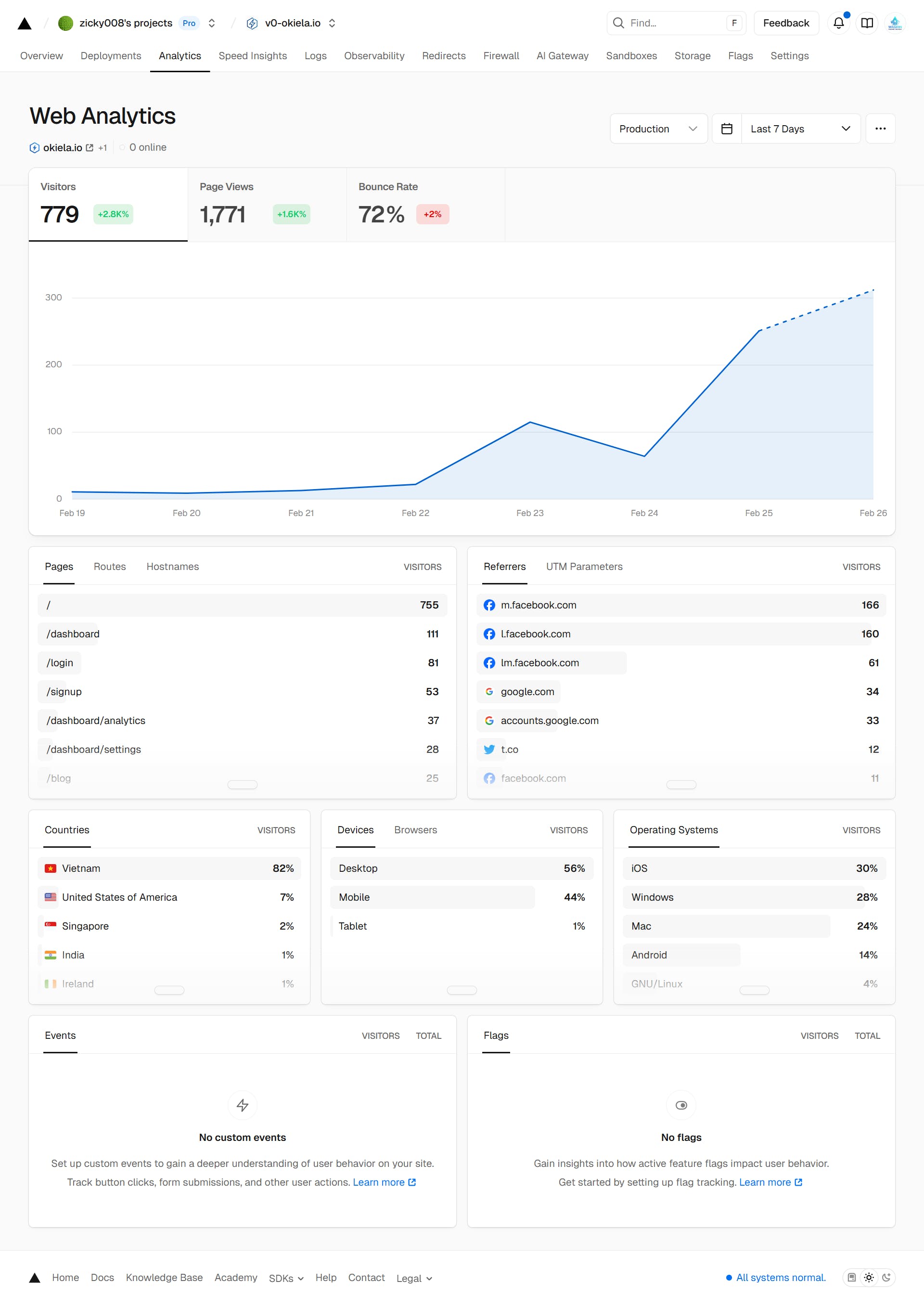 Vercel shows 779 visitors, 1,771 page views, 72% bounce rate. Most of the traffic is from Vietnam, with some from the US, Singapore… and most people hit the homepage, dashboard and login/signup.